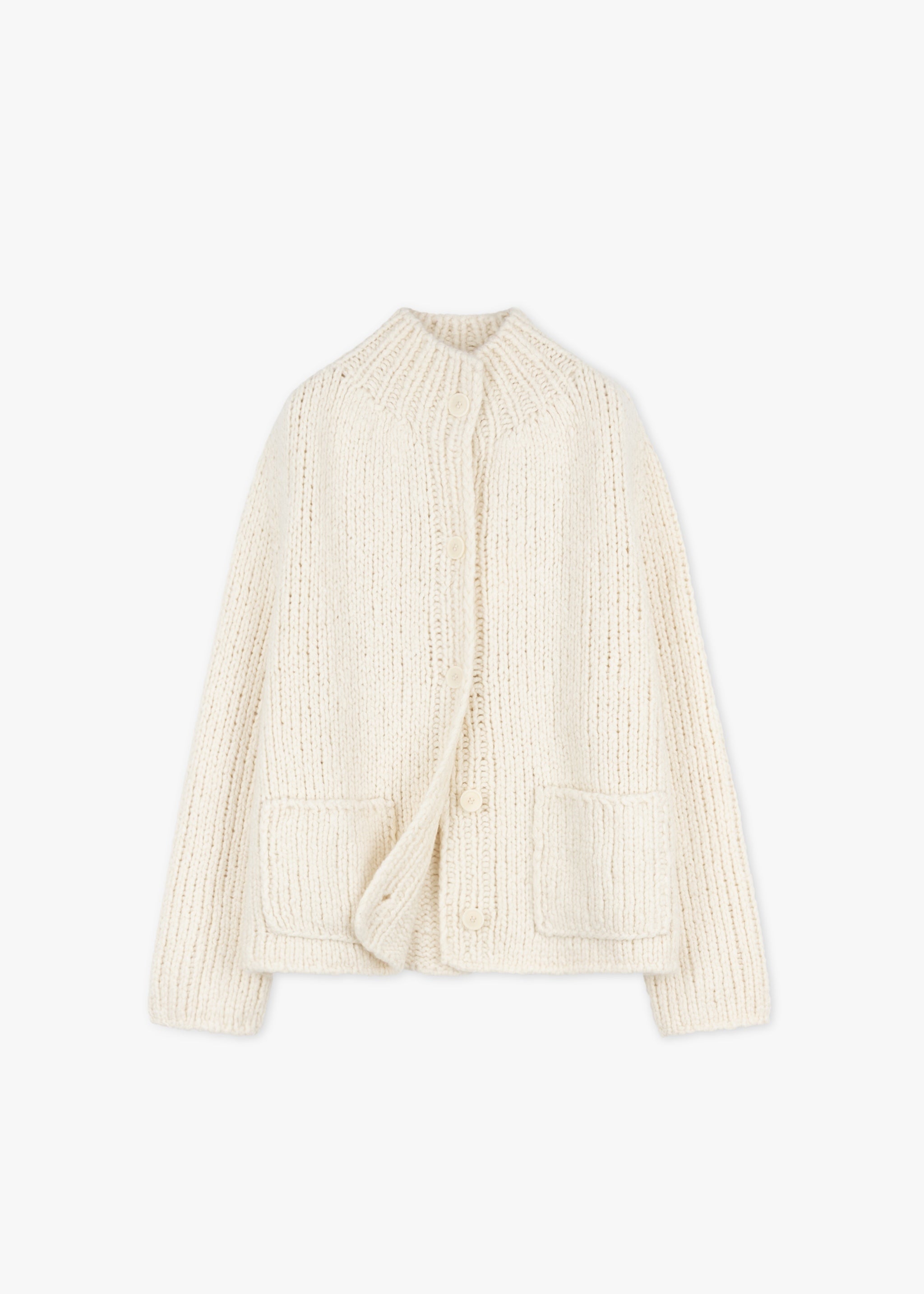 Handgestrickte Strickjacke von Wommelsdorff aus einer edlen Kaschmir-Seiden-Qualität, Effekt-Strick, Stehkragen, Knopfleiste, überschnittene Schultern, lange Ärmel, zwei aufgesetzte Taschen, gerader Saum.