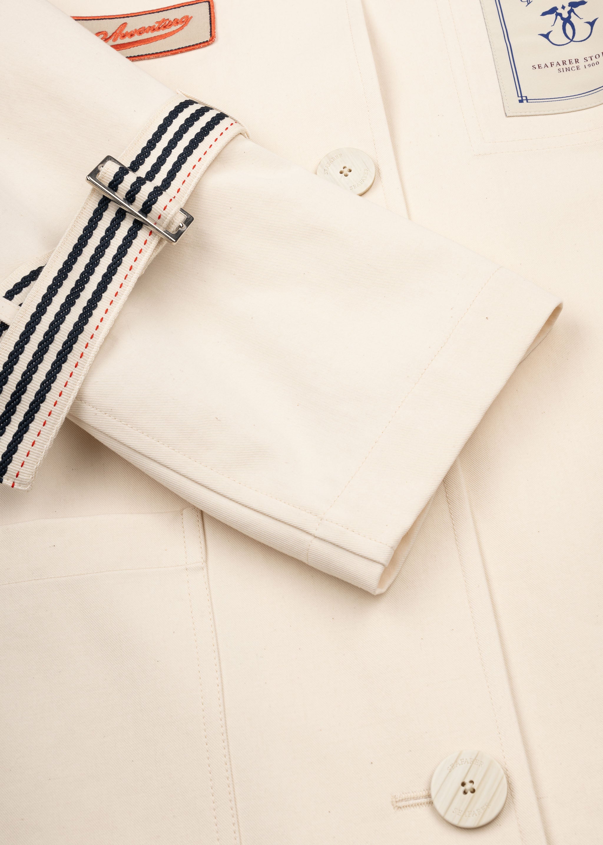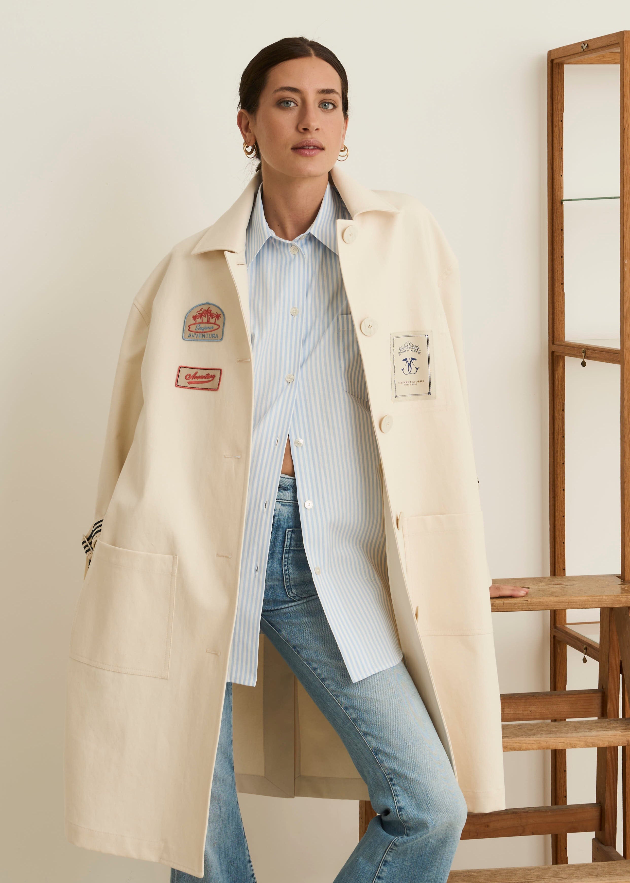 Lockerer Mantel 'Jolie' von Seafarer, klassischer Kragen, überschnittene Schultern, lange Ärmel mit Manschette zum Binden, Knopfverschluss, offene Seitennaht mit Eingriff, zwei aufgesetzte Taschen, eine Innentasche, Seafarer Aufnäher, Logo am Kragen, gerader Saum mit Gehschlitz.