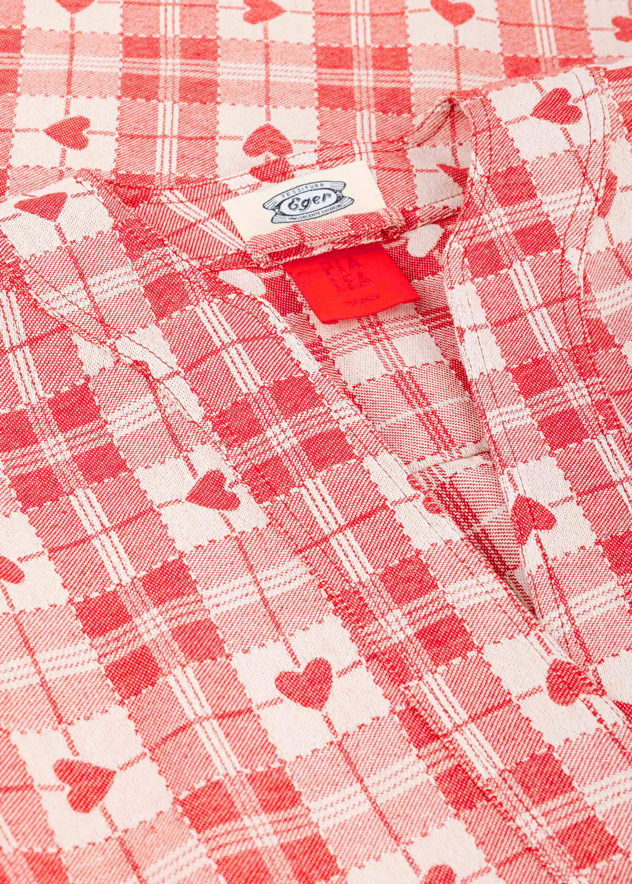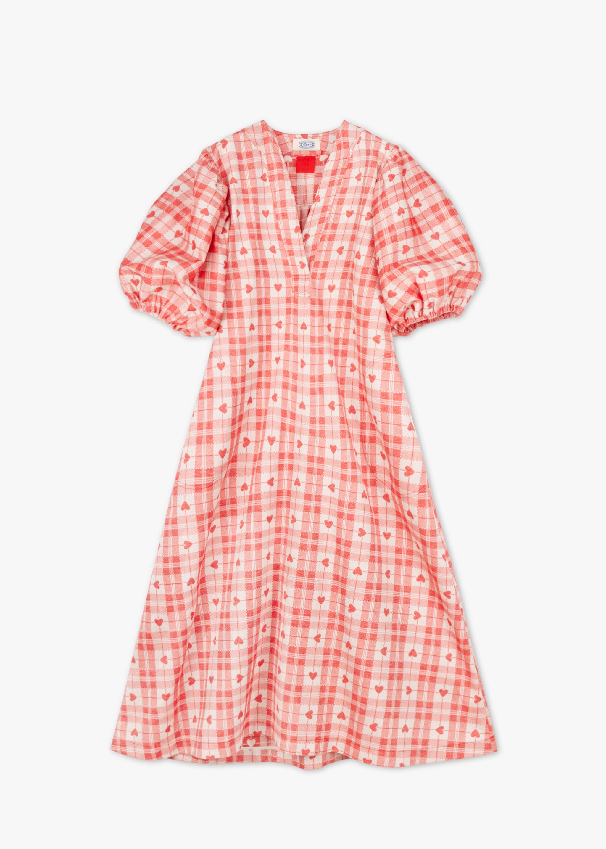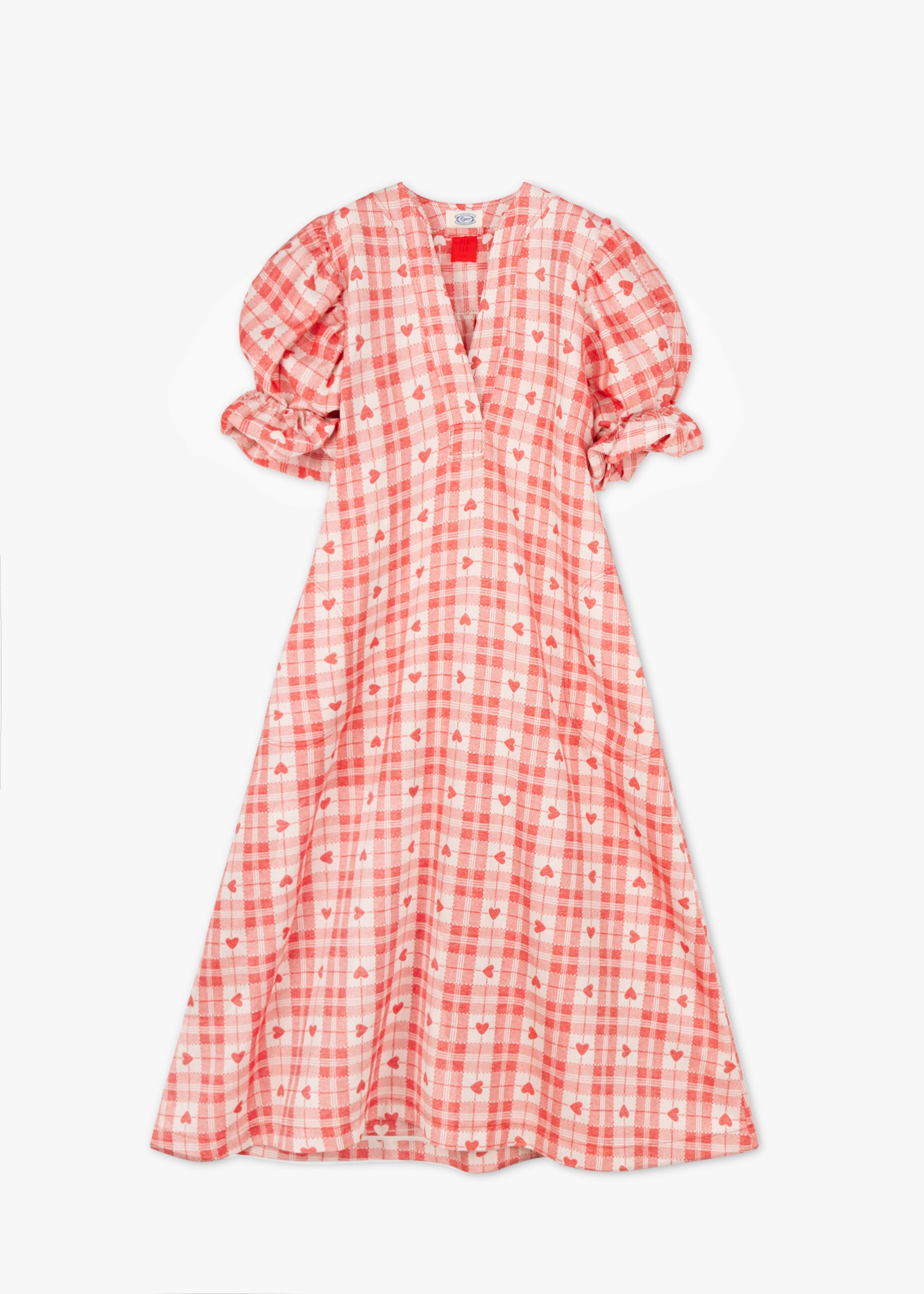 Kariertes 'Prinzessin' Dress mit Herzen von PiaLea x Tessitura Eger 1877 aus Baumwolle, V-Ausschnitt, kurze Puffärmel mit Gummizug, Rückenpasse mit gelegten Falten, seitliche Eingriffstaschen, gerader Saum.