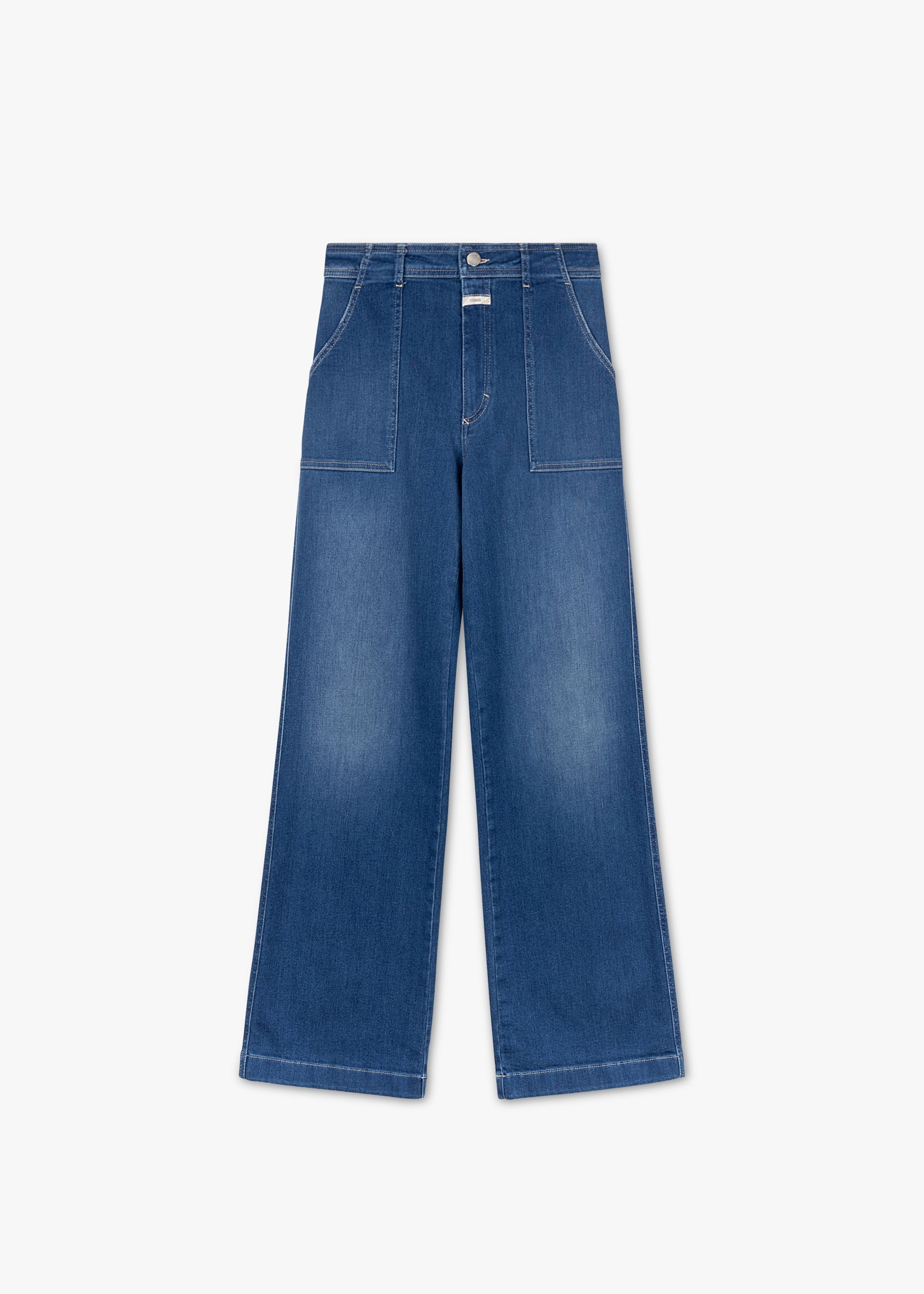 High Waist Jeans 'Aria' von Closed mit ausgestelltem Bein, Gürtelschlaufen, Knopf- und Reißverschluss, Bügelfalten, Workwear-inspirierte Taschen vorne, zwei Gesäßtaschen, Stretch-Anteil.