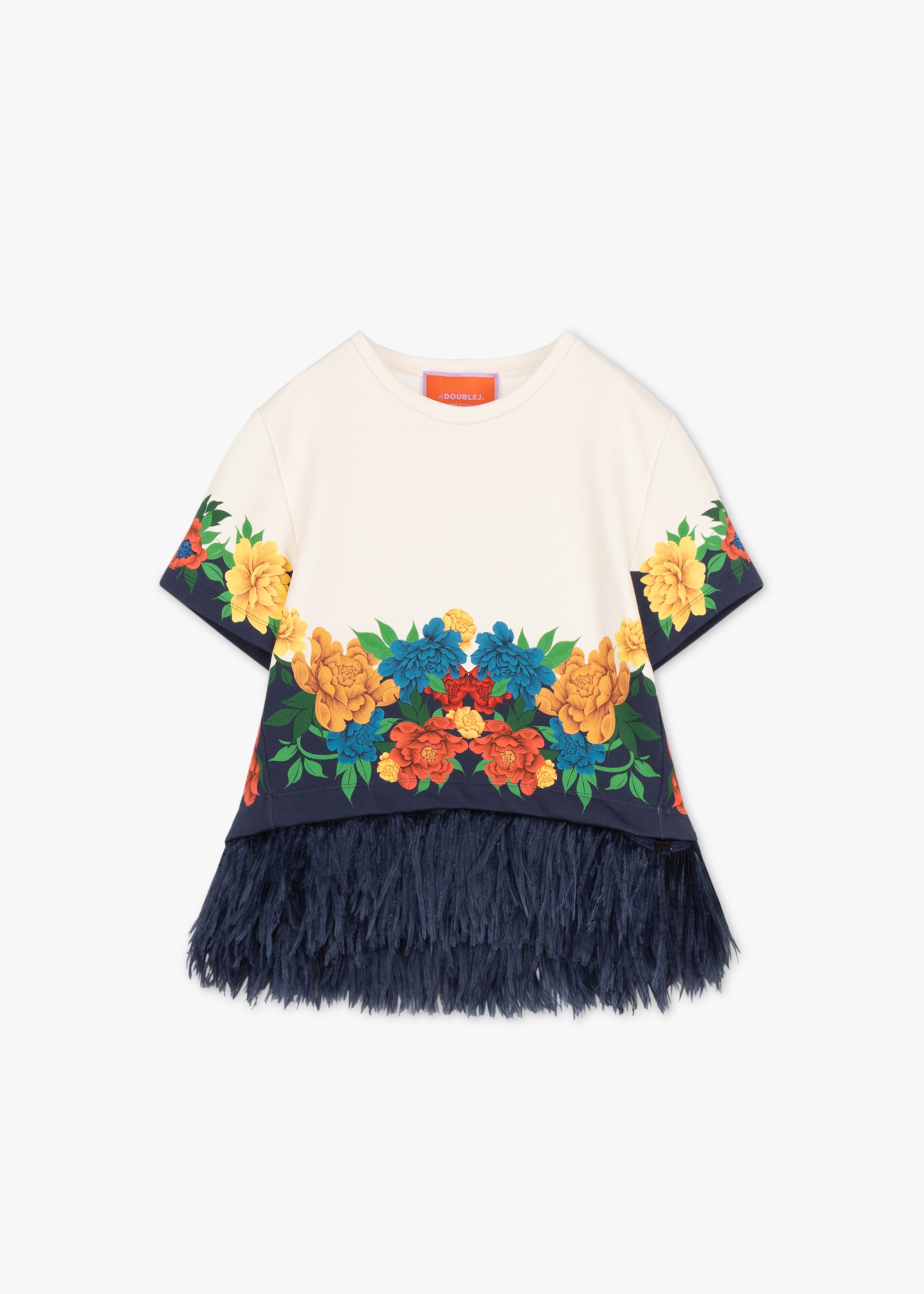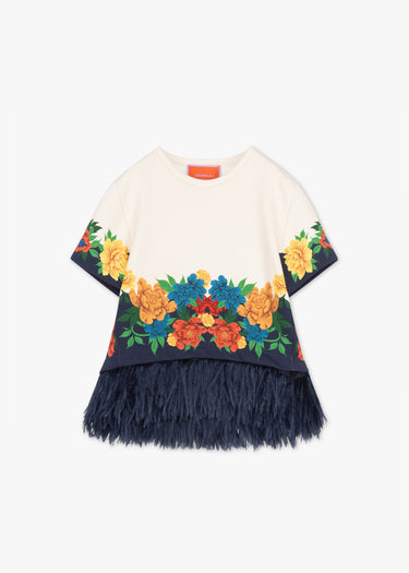 Kurzärmeliges Shirt 'La Scala Placée' von La Double J aus glattem Heavy-Jersey, Rundhalsausschnitt, von Hand platziertem Pfingstrosen-Print, abnehmbarer Straußenfederbesatz, gerader Saum.