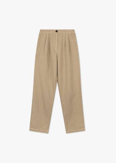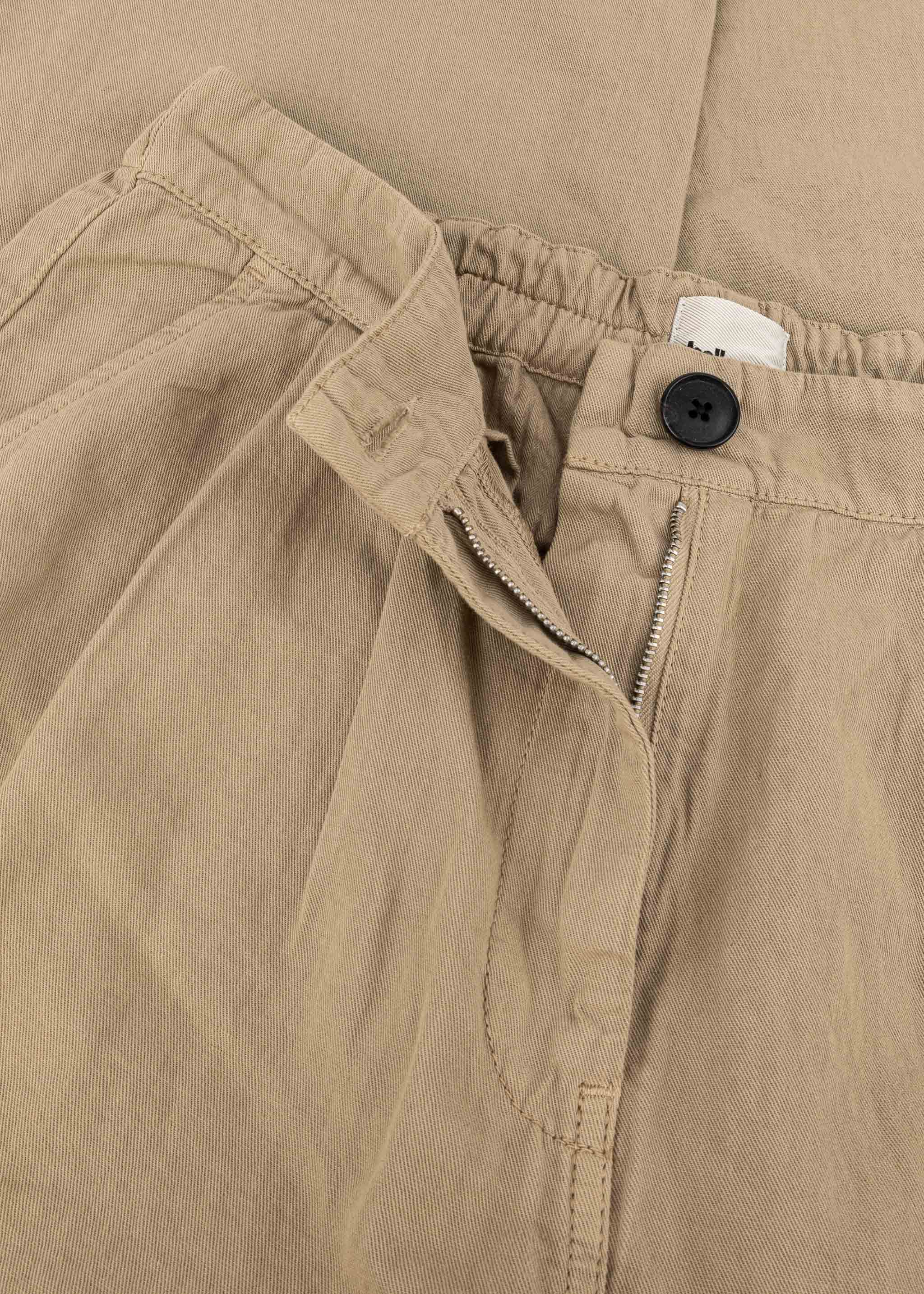 Hose 'Pillow' von Bellerose aus einer weichen Baumwoll-Leinen-Mischung, elastischer Bund hinten, Knopf- und Reißverschluss, Bundfalten, seitliche Eingriffstaschen, zwei Gesäßtaschen, lockeres Bein.