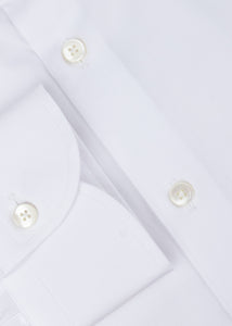 Handmade shirt by Dantendorfer made of soft cotton, with a cutaway collar, back yoke, long sleeves with button cuffs, full-length button placket, and rounded hem.