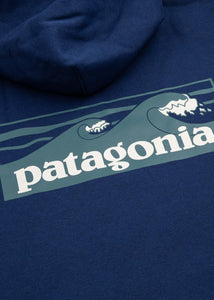 Sweatshirt 'Boardshort Logo' by Patagonia made from recycled materials, hood with drawstring, long sleeves, logo print on the back, kangaroo pocket , fluffy inside, ribbed cuffs, straight hem.