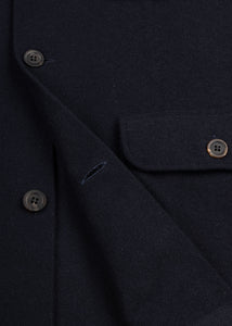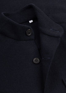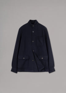 Partially lined 'Traveller' jacket by 100 Hands made of premium Loro Piana cashmere, featuring a stand-up collar, button placket, back yoke, buttoned cuffs, one breast pocket, two flap pockets, and a straight hem with side slits.