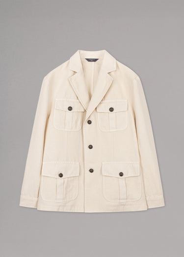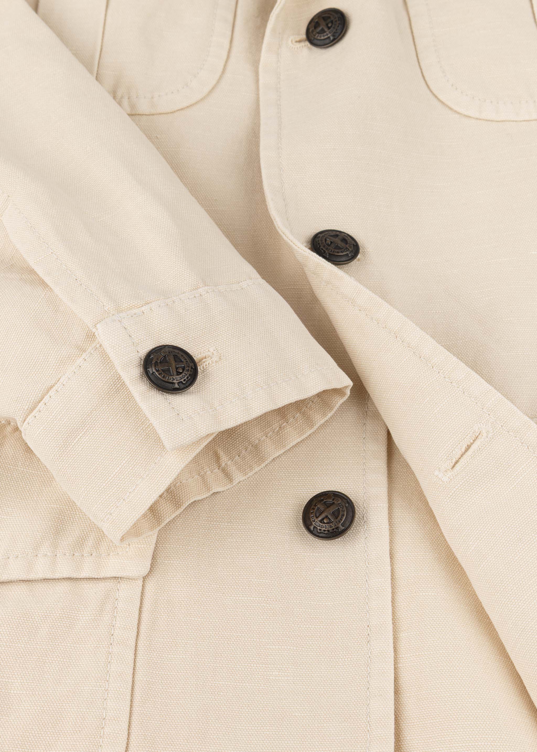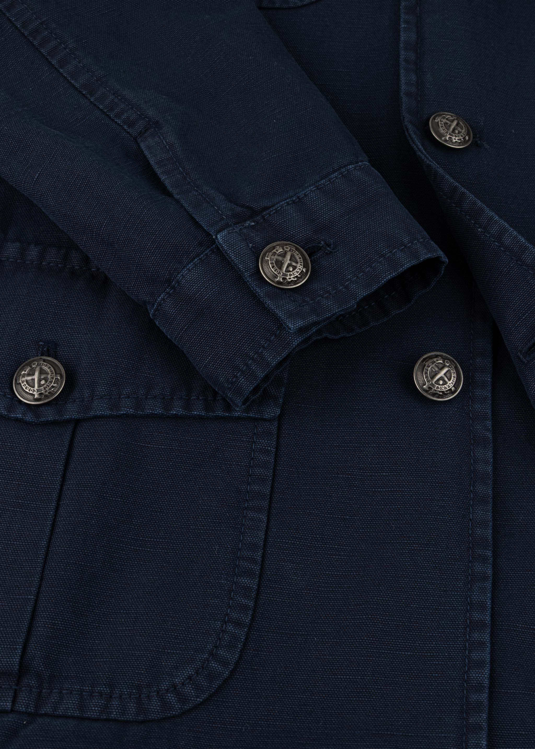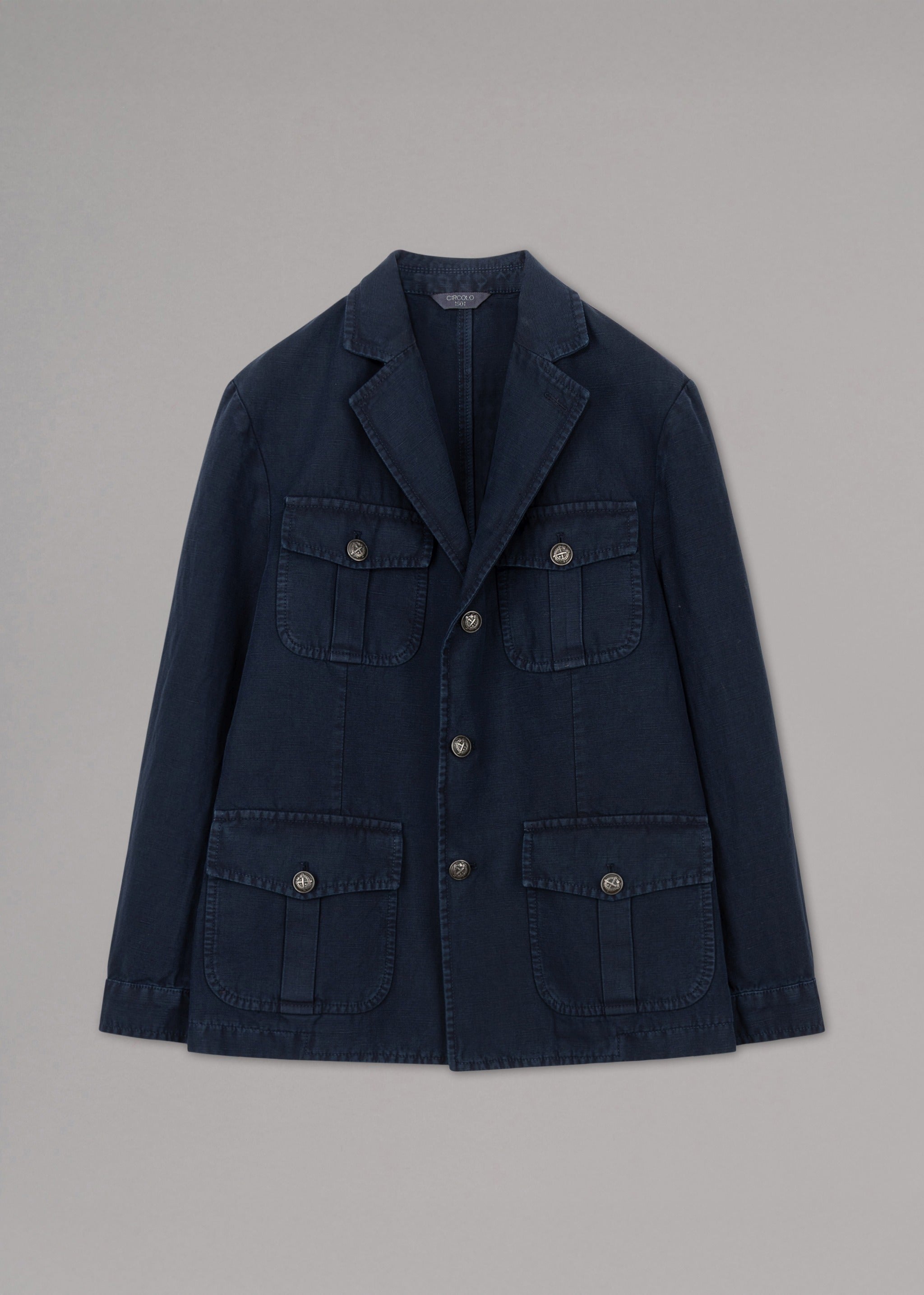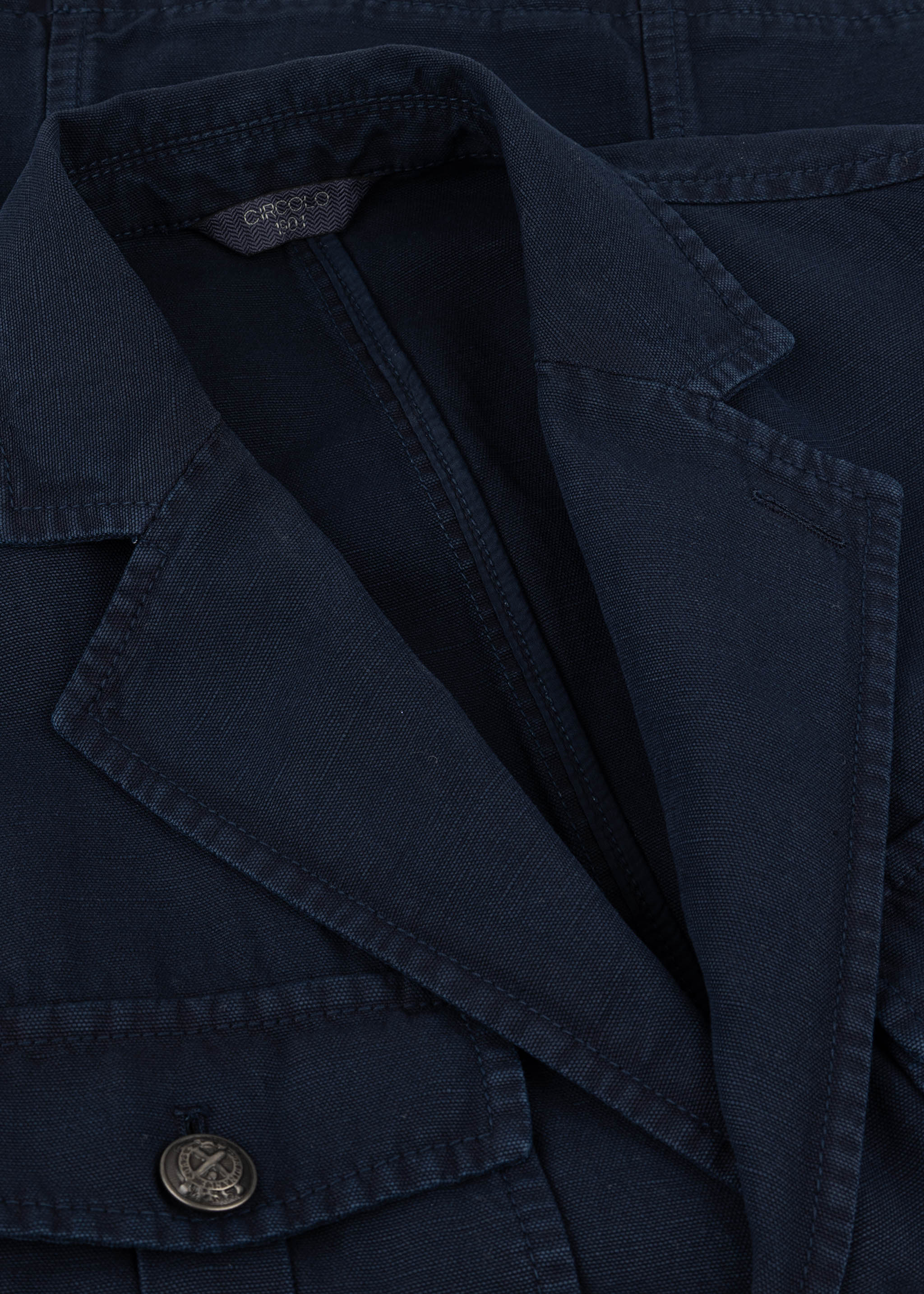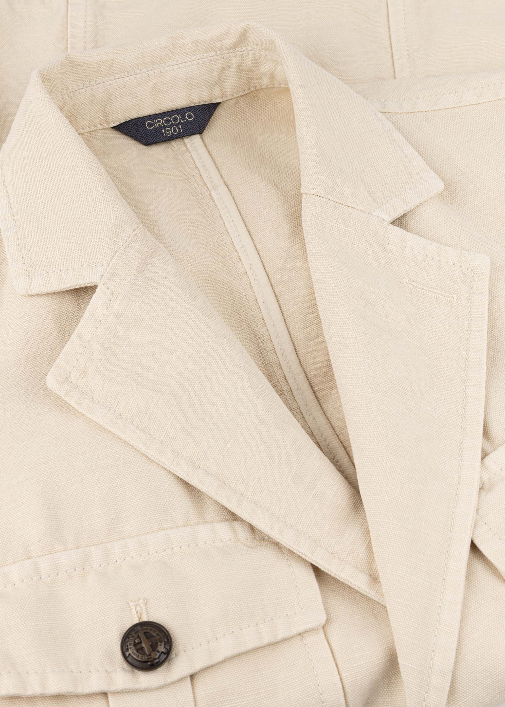 Single-breasted jacket by Circolo 1901 in textured linen-cotton canvas, notched lapels, long sleeves with buttoned cuffs, statement buttons, multiple utility pockets, one inside pocket, unlined finish, straight hem.