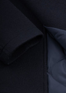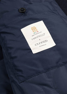Double-breasted jacket by Closed made from a soft wool blend, featuring a wide lapel with a storm flap, long sleeves, side pockets, one inside pocket, a straight hem, a vent, and a quilted lining.