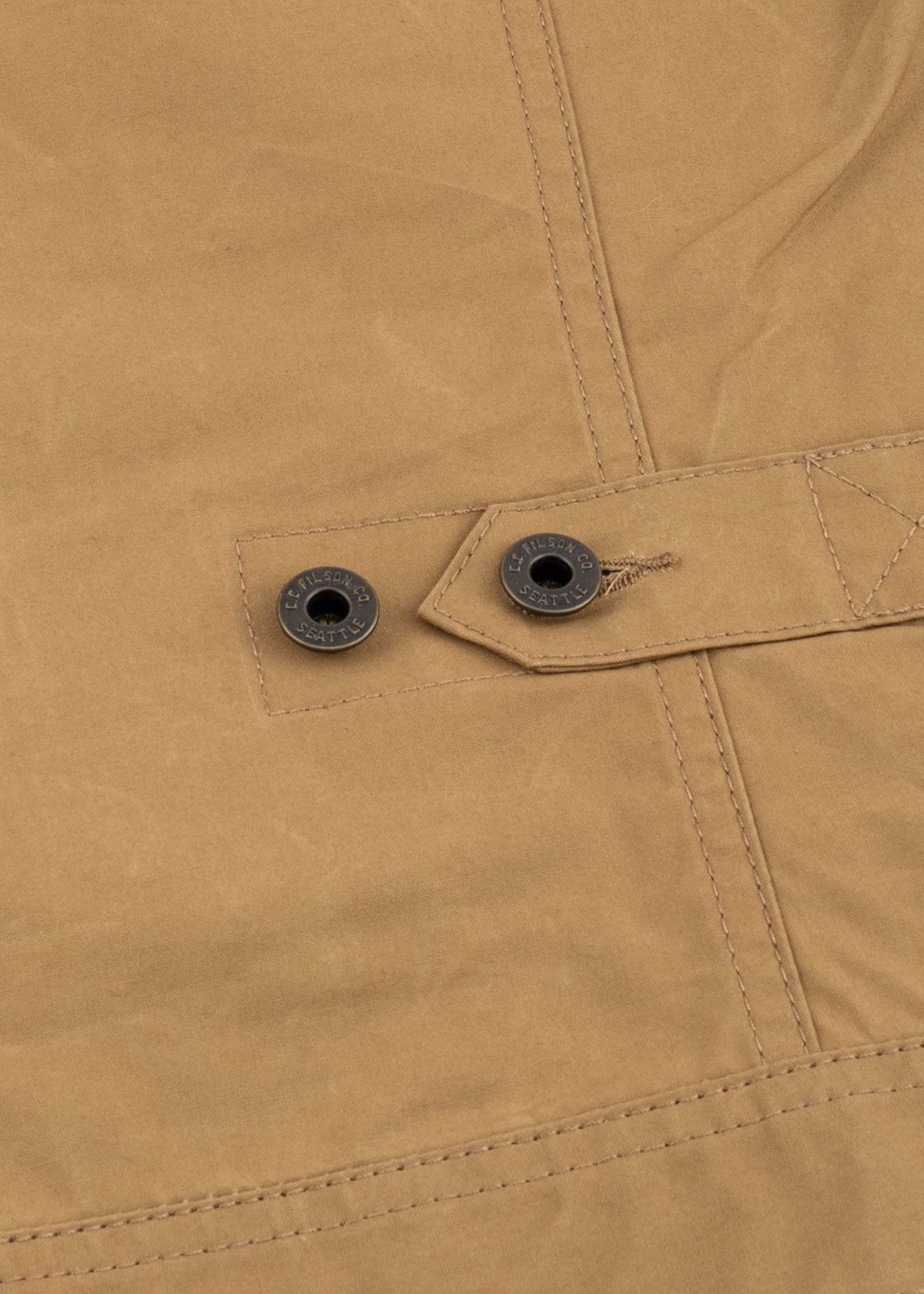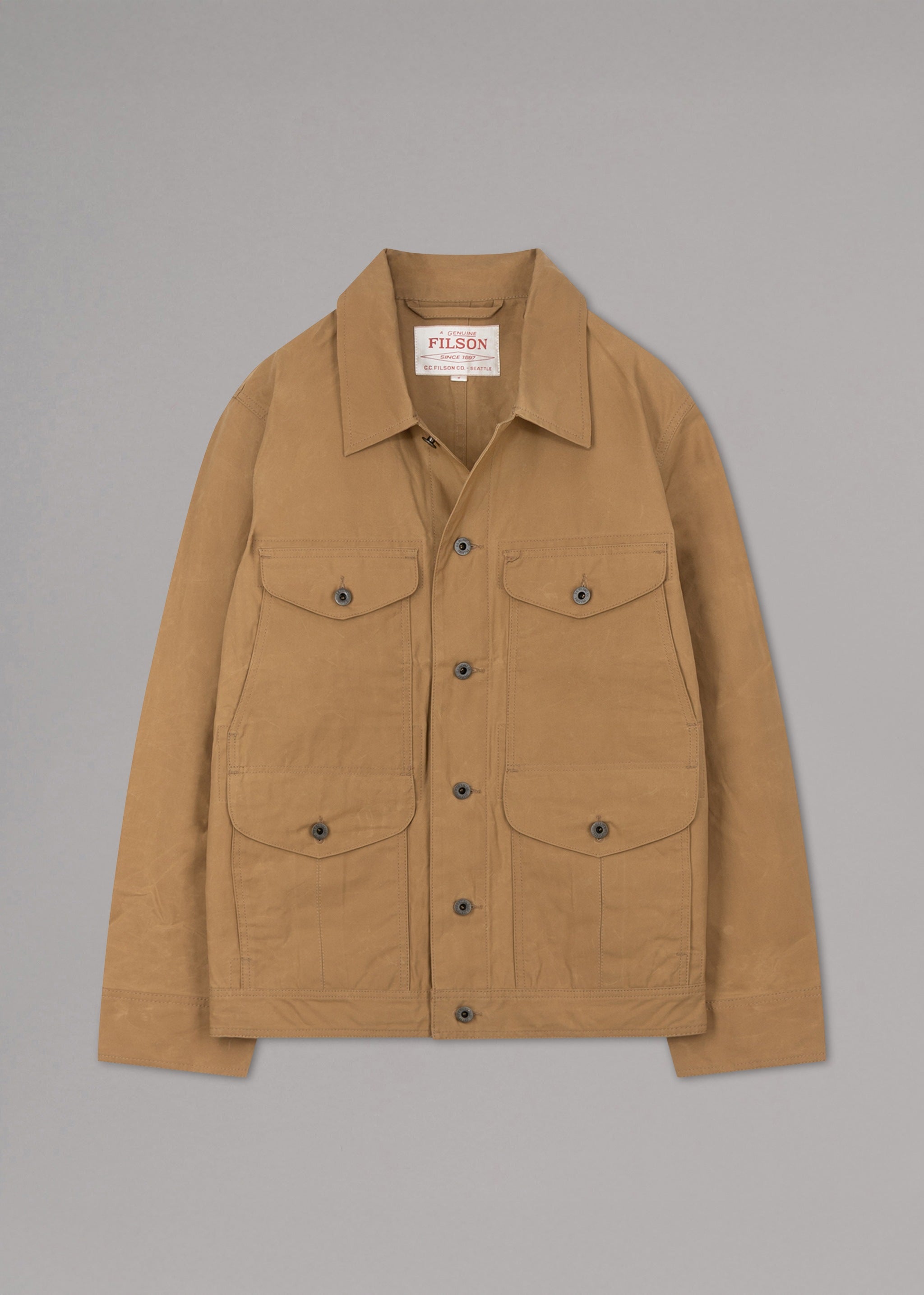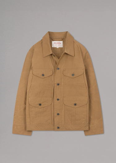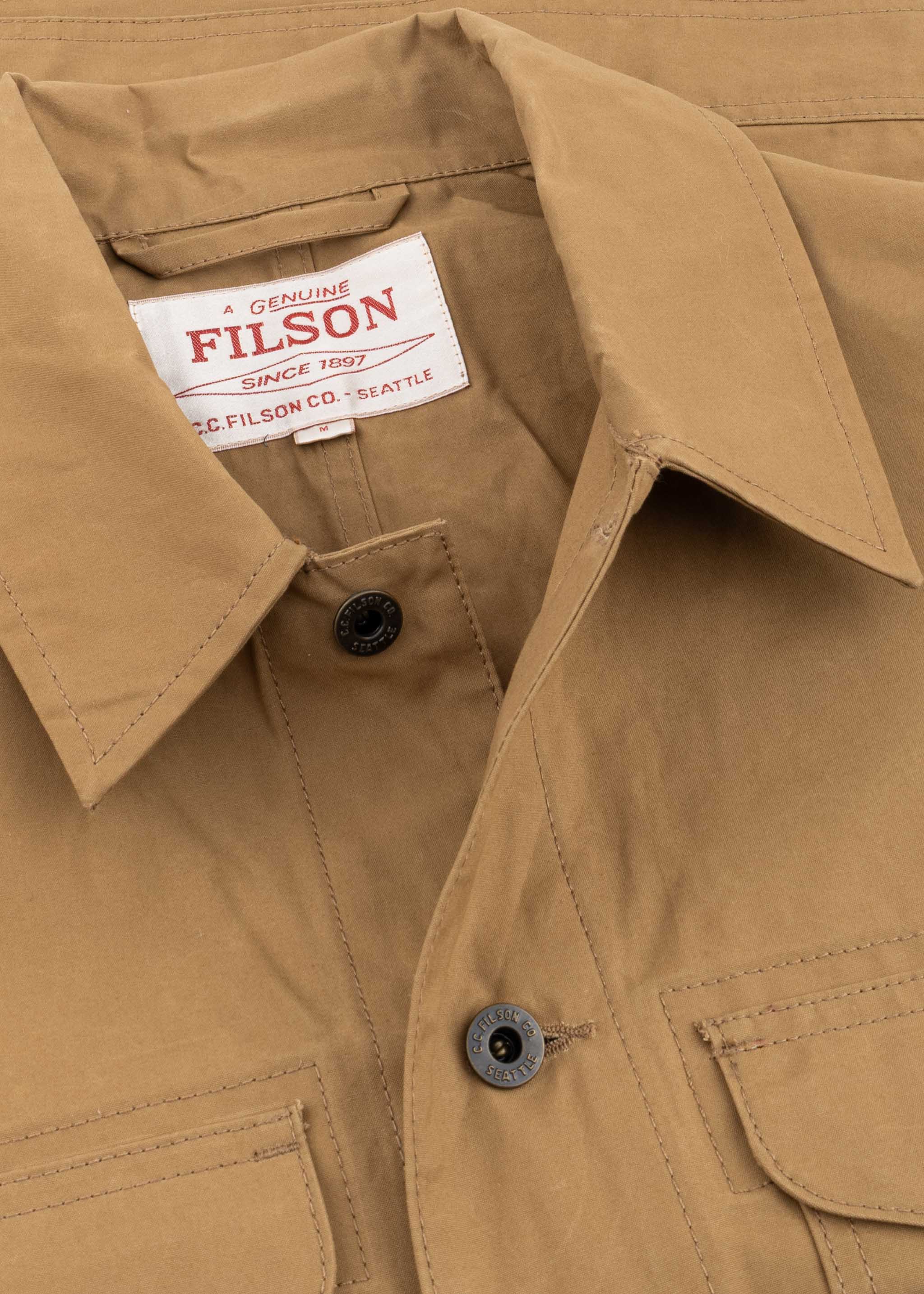 Jacket by Filson made of waxed cotton canvas, classic collar, long sleeves with buttoned cuffs, button placket, four patch pockets with combined opening, waist tab , straight hem, unlined finish.