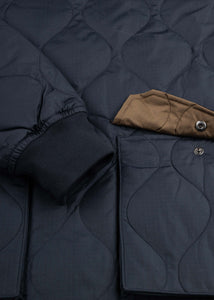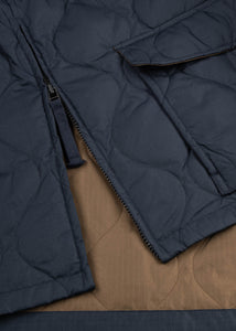 Quilted windbreaker by Taion, stand-up collar with hood, button placket and drawstring, long sleeves with ribbed cuffs, two patch pockets with snap fasteners, straight hem with side zips for additional ventilation, lined