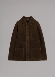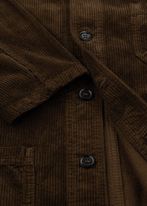 Loose-fitting worker jacket by the French label Vétra made of soft corduroy and cotton, featuring a classic collar, full-length button placket, three patch pockets, one inside pocket, a straight hem, and an unlined finish.