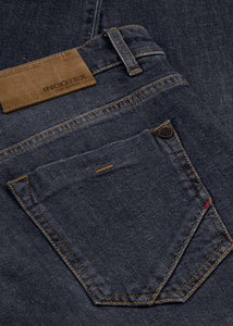 Slim-fit jeans by Incotex Blue Divison, belt loops, button closure, 5-pocket style, logo patch, contrast stitching, and stretch content.