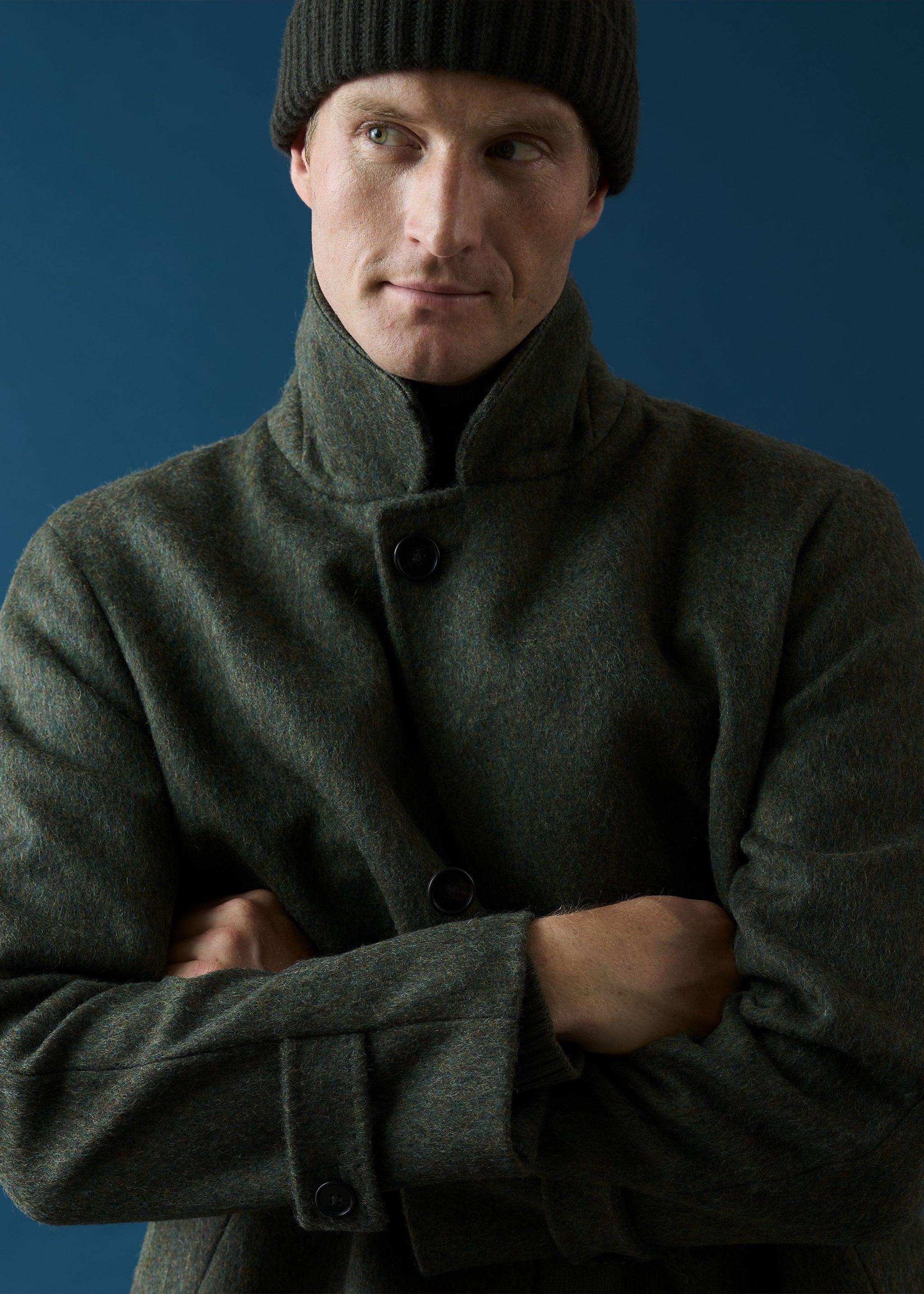 Lined coat by Carlo Piombo in virgin wool, notched lapels, long sleeves with tabs, side pockets, two inside pockets, straight hem with slit.