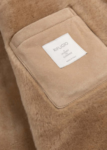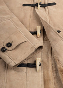 Buttery soft shearling coat by Rifugio, hood with straps, duffle coat closure with horn buttons, patch flap pockets, straight sleeves with tabs, inside pocket, shearling lining.