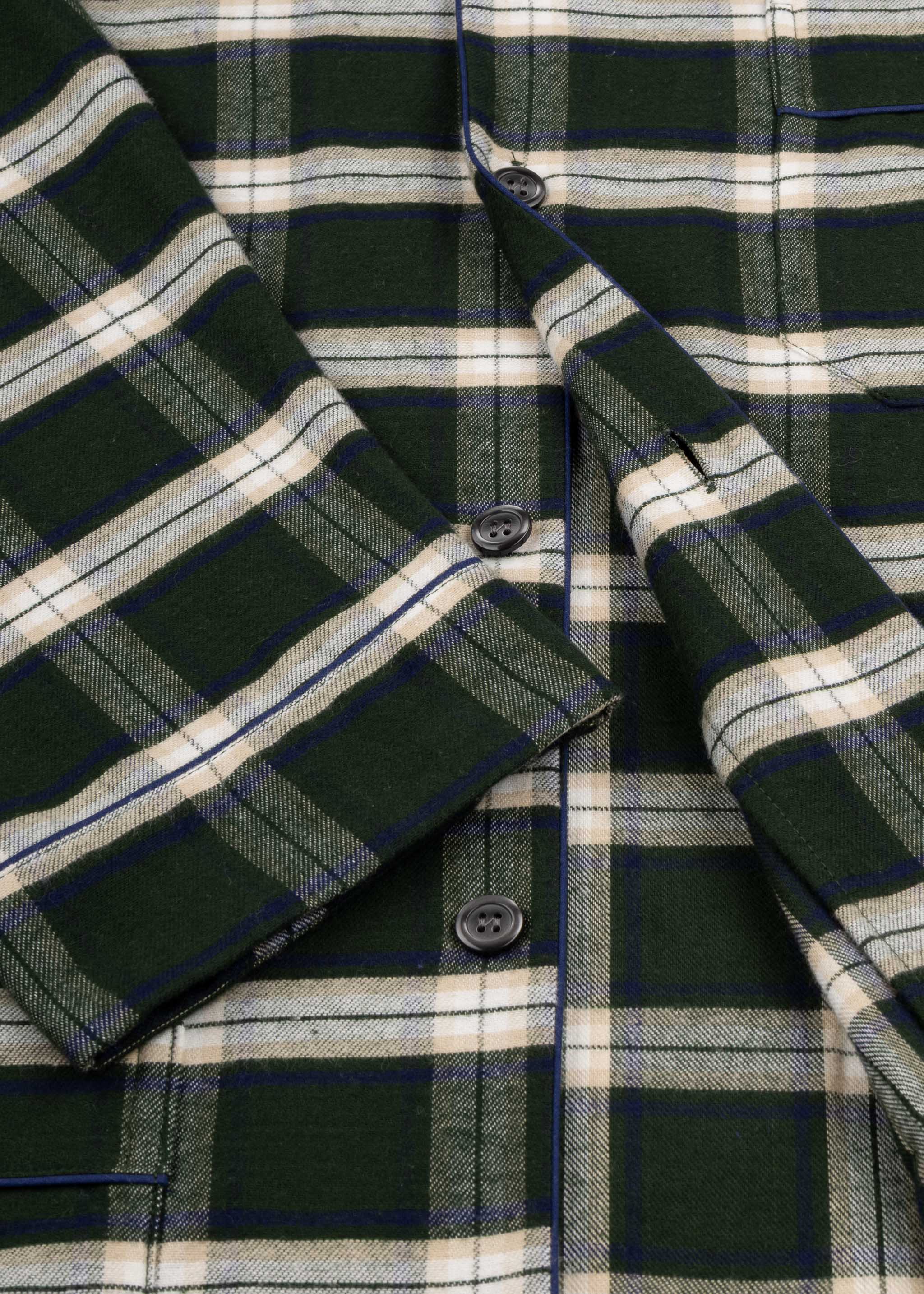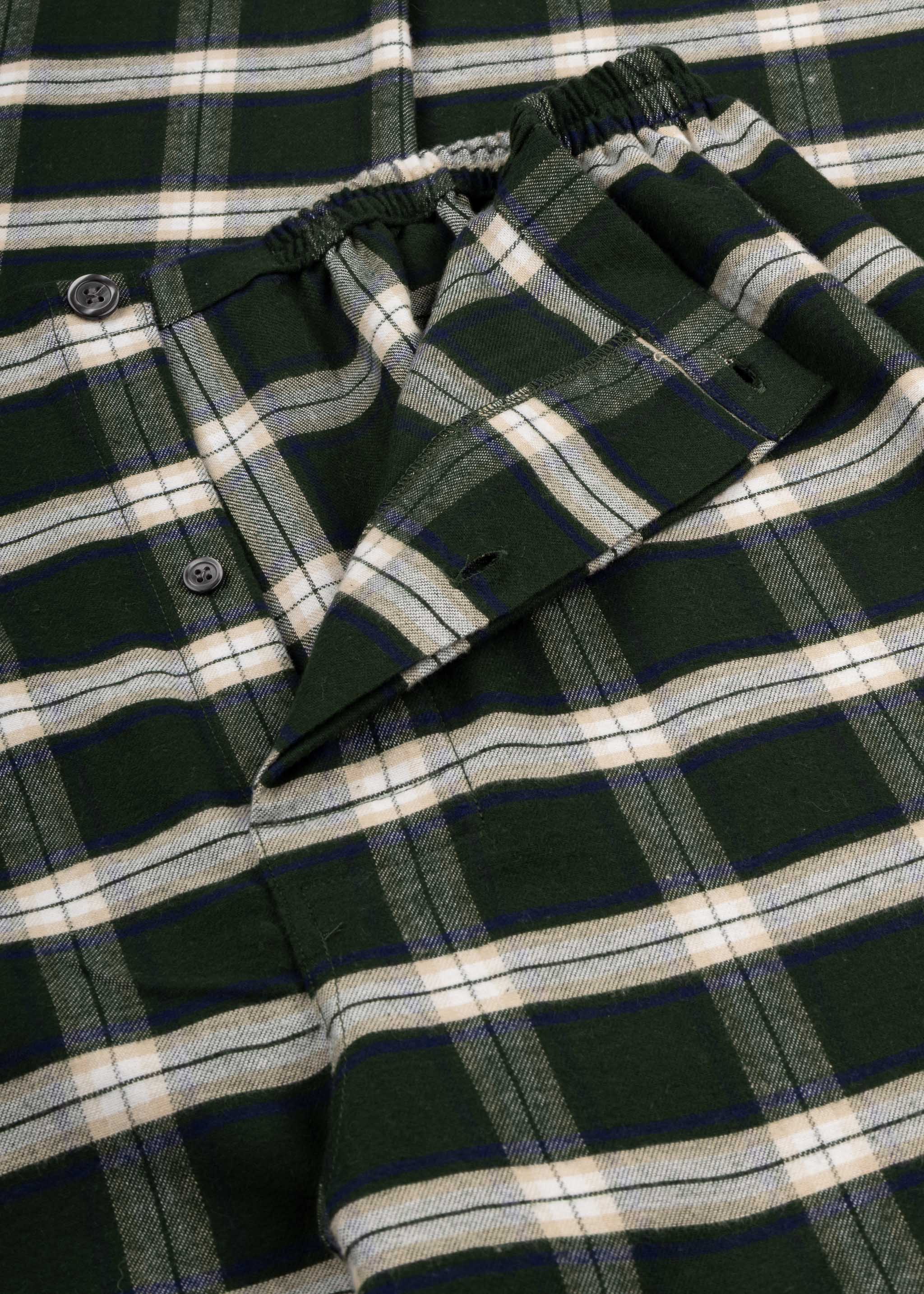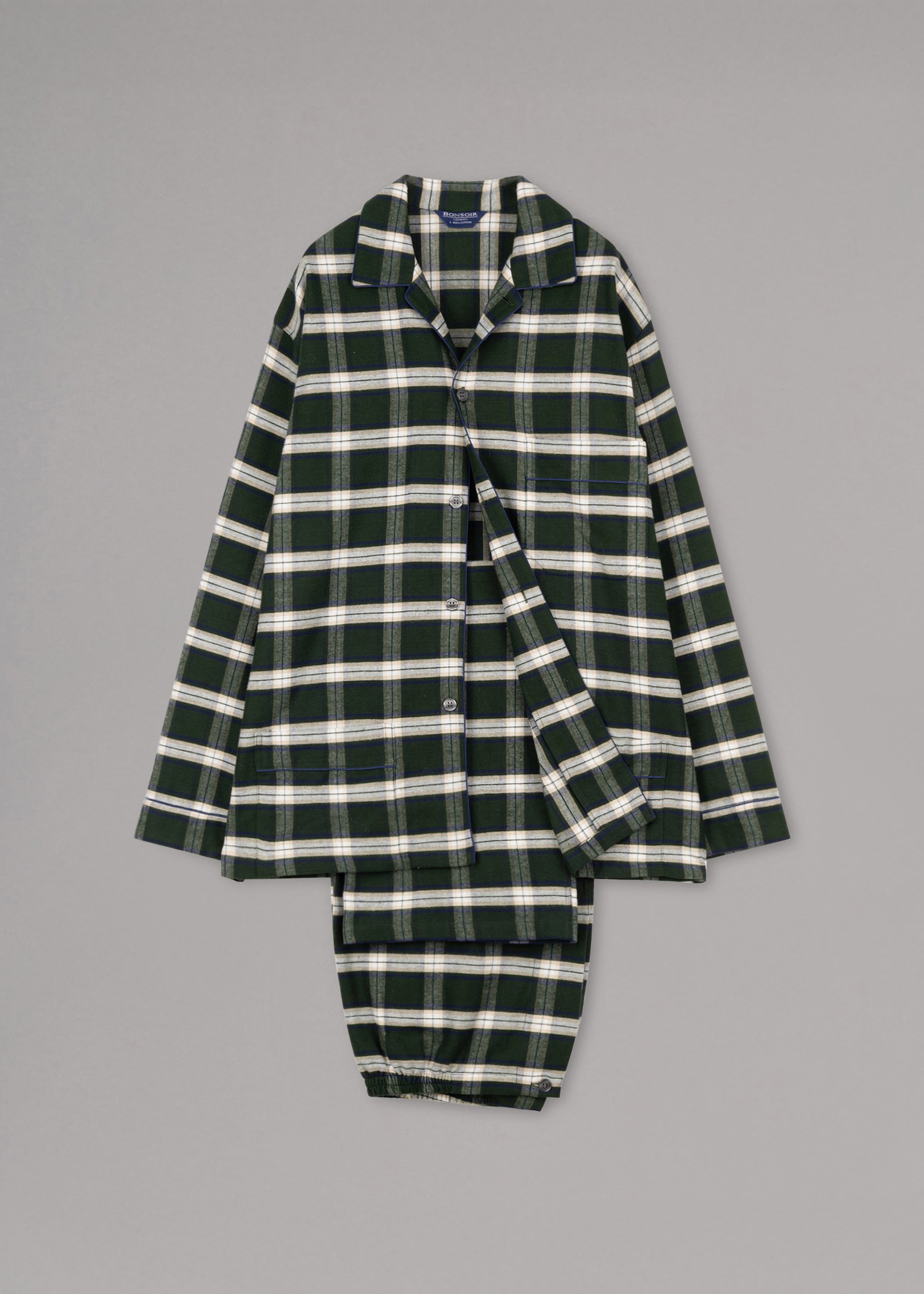 Bonsoir's 'Holtwood' checked flannel pajama set in brushed cotton, featuring a classic collar, three patch pockets, full button placket, straight hem, and trousers with elasticated waistband and button closure.