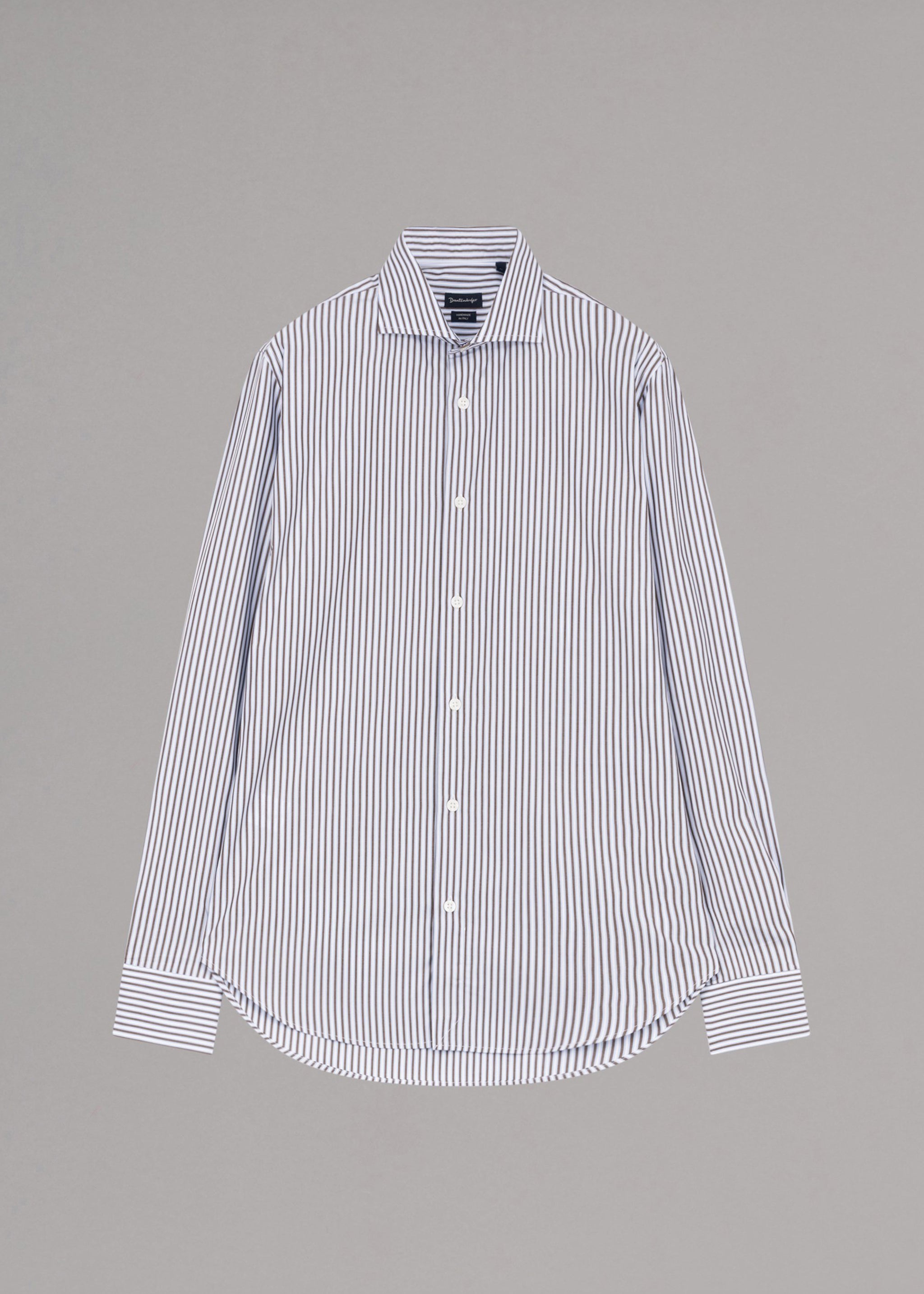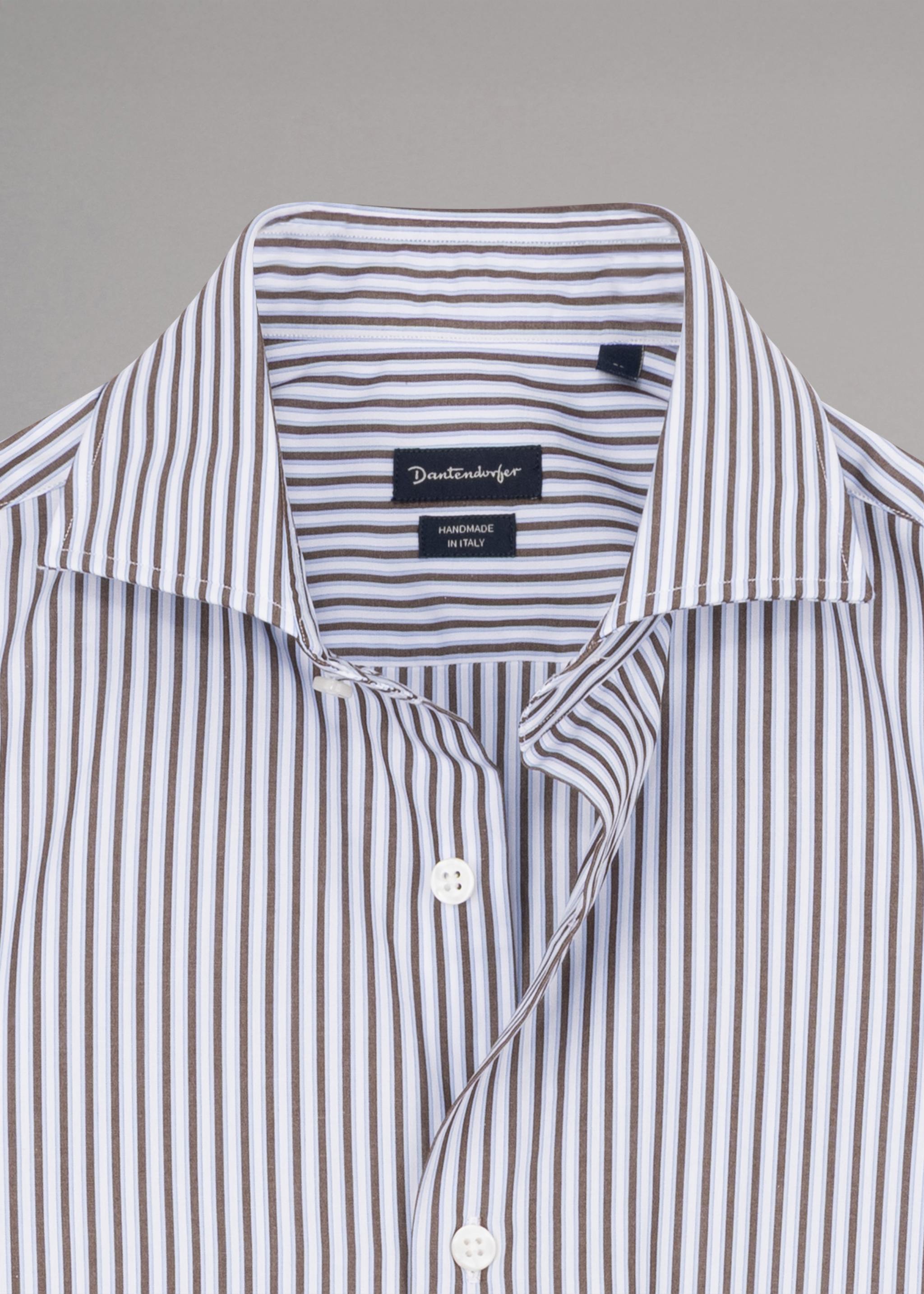 Dantendorfer cotton shirt with a cutaway collar, back yoke, long sleeves with button cuffs, full-length button placket, and rounded hem.