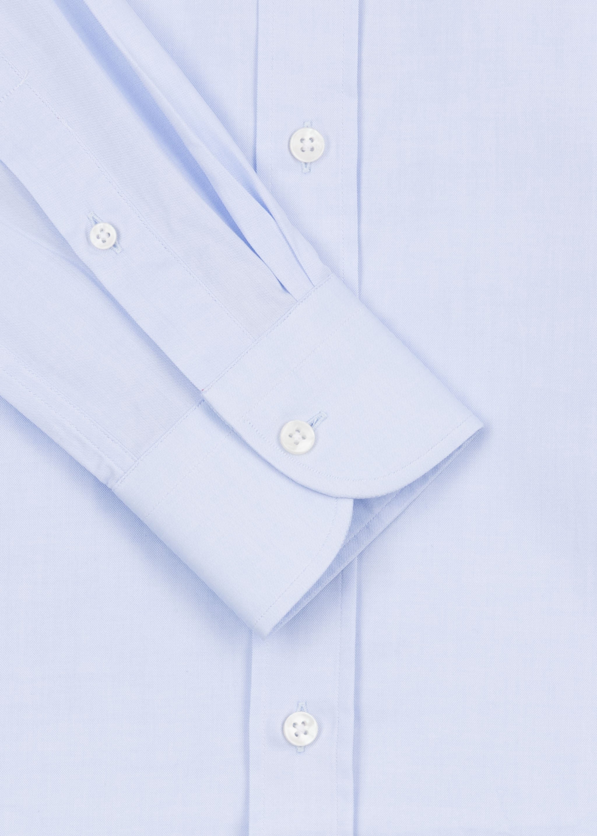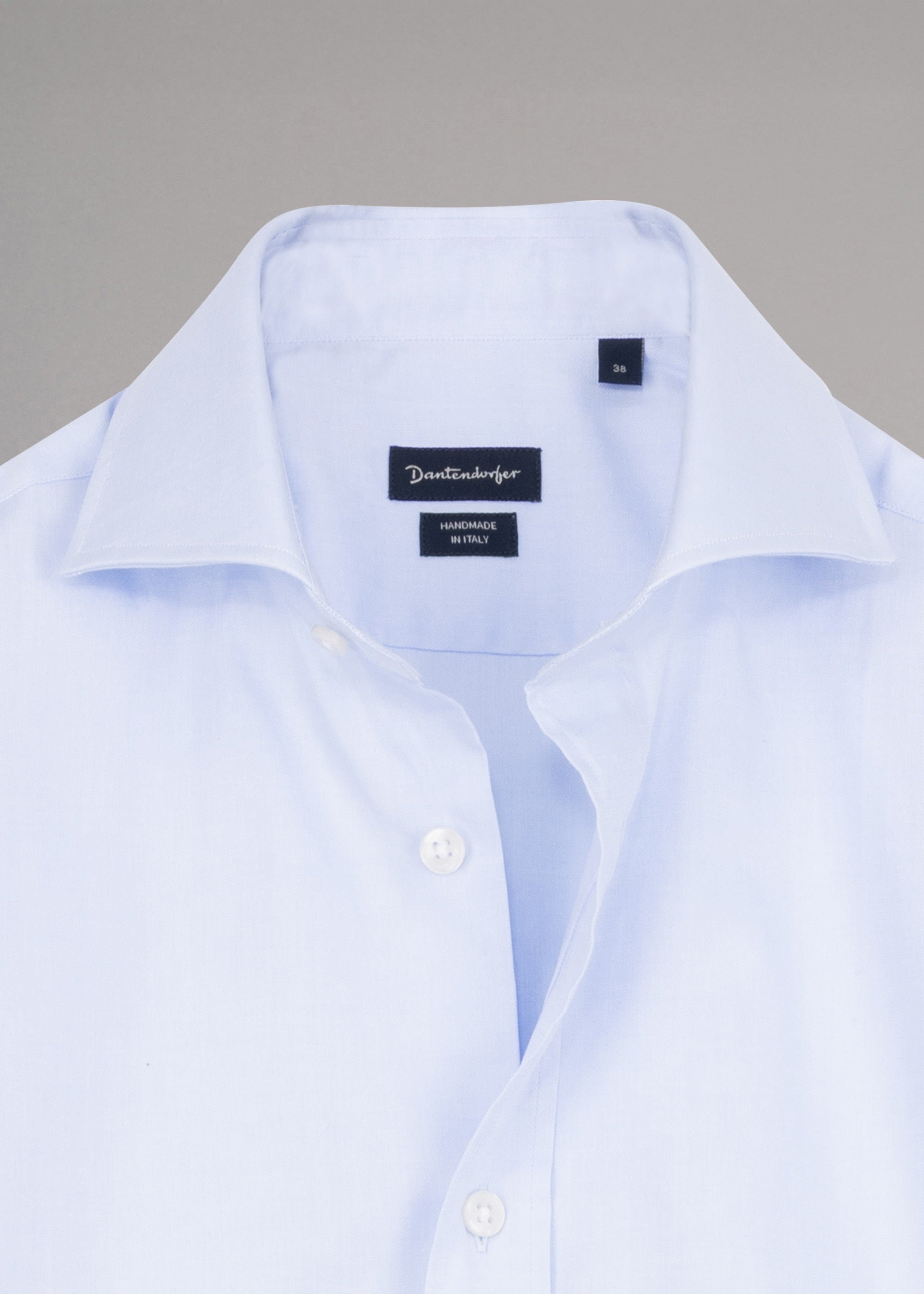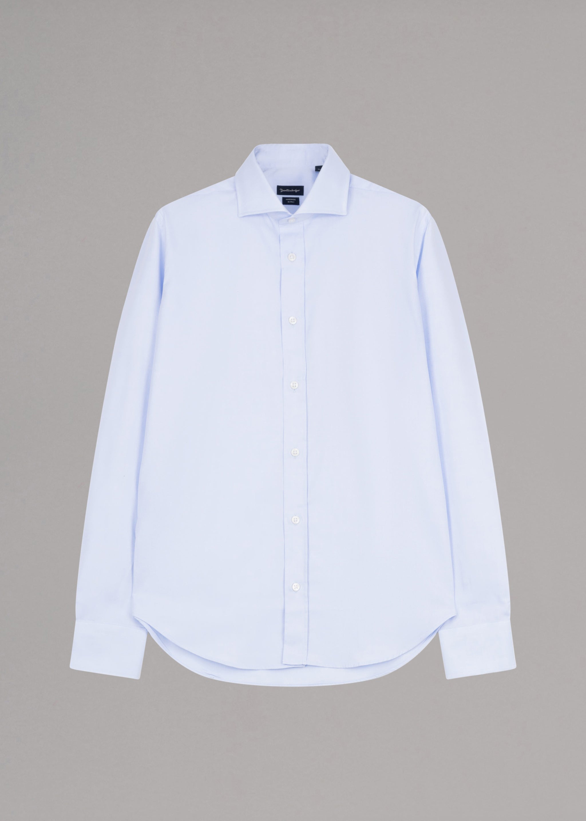 Dantendorfer cotton shirt with a cutaway collar, back yoke, long sleeves with button cuffs, full-length button placket, and rounded hem.
