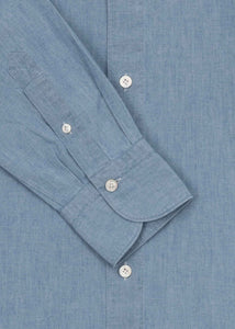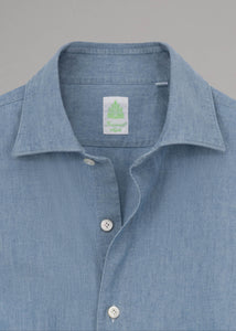 Fine denim emd 'Luigi Gaeta' by Finamore, shark collar, full-length button placket, long sleeves with button cuffs, rounded hem.