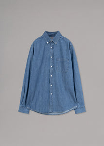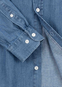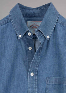 Portuguese Flannel denim shirt made of cotton, button-down collar, back yoke with pinch pleat, long sleeves with button cuffs, full-length button placket, one breast pocket, and rounded hem.