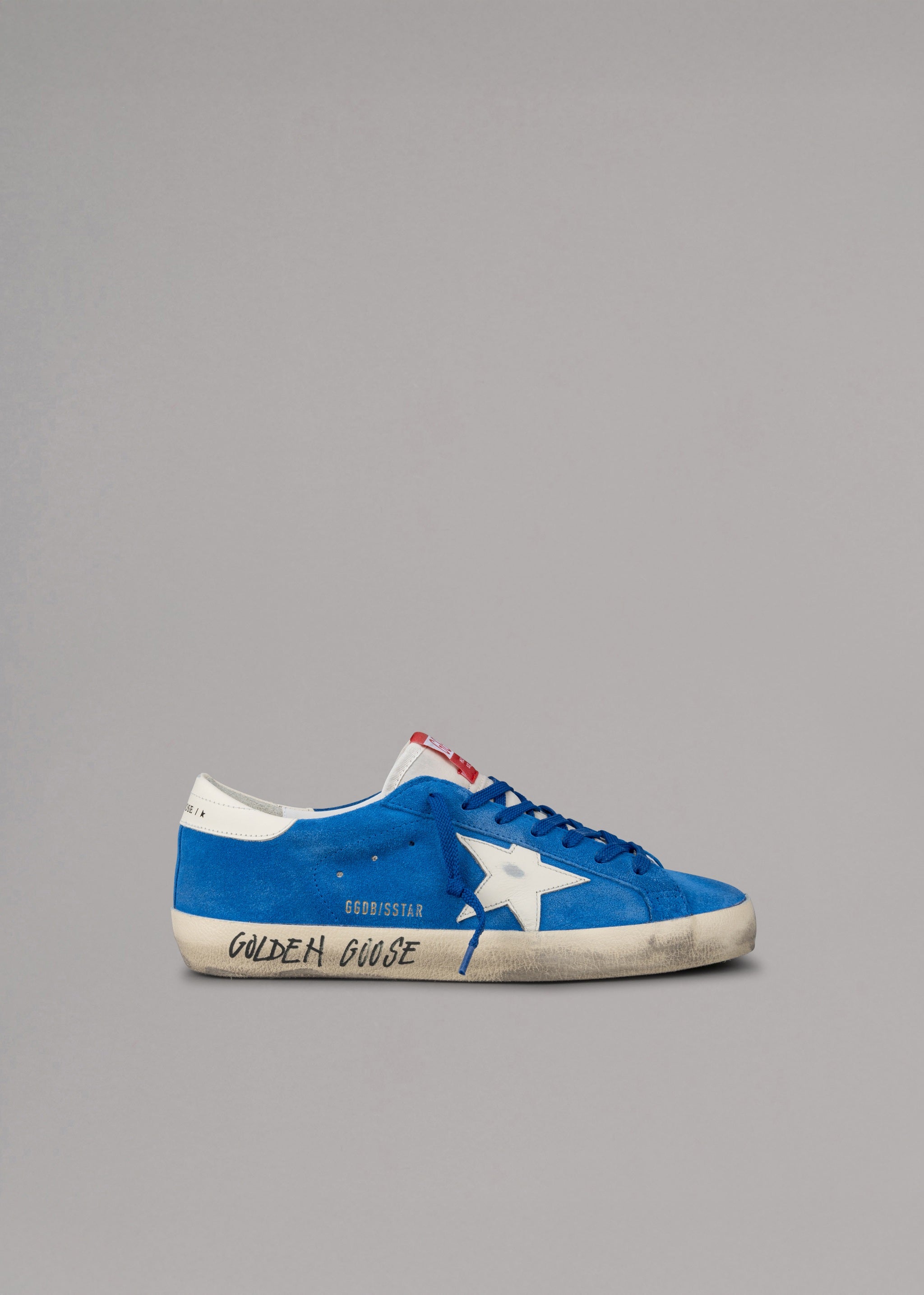 'Super-Star' sneakers by Golden Goose in suede, 'Golden Goose' lettering, vintage treatment.