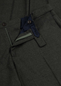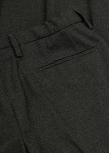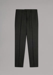 Slim-fit trousers with belt loops, button closure with bar and zip, elastic waistband, side pockets, piped back pockets, pressed pleats, and open leg hem for individual length adjustment.