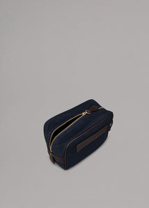 Travel case by Felisi made of robust cotton canvas with dark brown leather trim, black nylon lining, and elegant brass details.