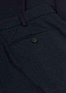 Cellar Door's 'Cambridge' trousers made from fine virgin wool, featuring belt loops, an elastic waistband with hook and zip fly, pleats, side pockets, buttoned back pockets, and a turn-up hem.