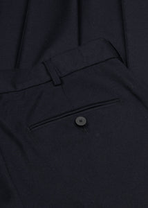 Dark blue trousers 'Cambridge' by Cellar Door made of a wool-cashmere fabric, elastic waistband, side pockets, piped pockets with button at the back, leg with cuff and closes with zip and hook.
