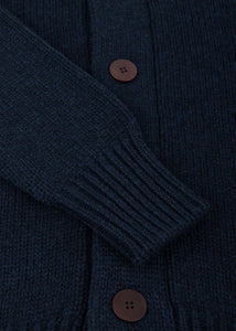 Dark blue knitted cardigan by Buttertea, stand-up collar, continuous button placket, ribbed trims and long sleeves.