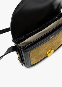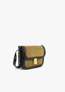 Soeur shoulder bag with an adjustable leather strap made of smooth and suede, one zipped compartment, three interior pockets, cotton lining, front flap with gold monogram closure, and gold metal hardware.