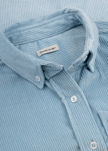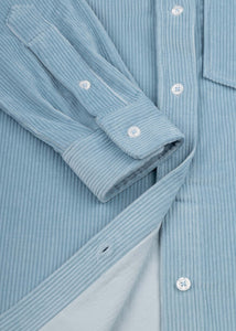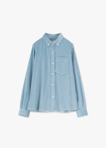 Handmade blouse by Dantendorfer made of soft corduroy, featuring a button-down collar, long sleeves with button cuffs, a full-length button placket, one breast pocket, a back yoke with side pleats, and an open hem.