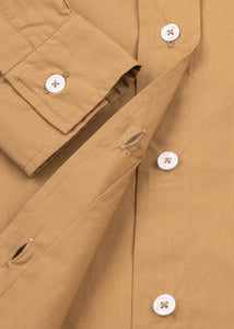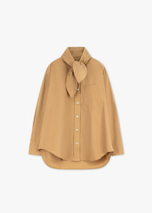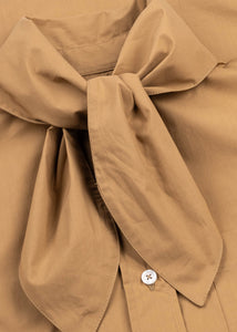 Loose tie-neck blouse by Dantendorfer made of soft cotton, with a shawl collar, long sleeves with button cuffs, dropped shoulders, back yoke, one breast pocket, button placket, and a mullet hem.
