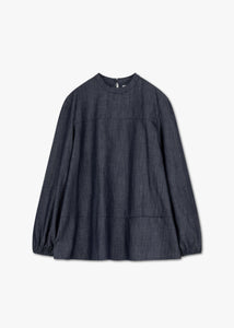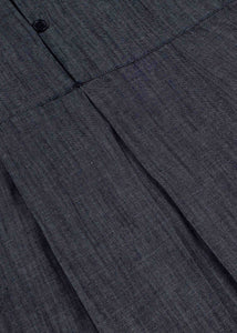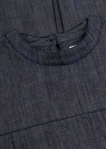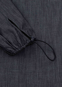 Long denim blouse by YMC made of organic cotton chambray, round neck with button closure, back yoke with box pleat, slightly dropped shoulders, voluminous sleeves with drawstring, one welt pocket, straight hem.