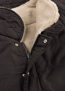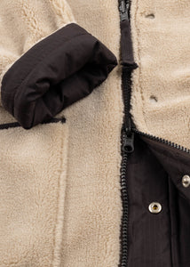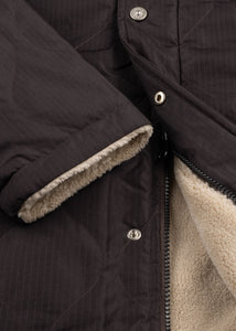 Quilted coat by Taion, stand-up collar with storm flap, teddy fleece, long sleeves, two-way zip closure, snap button placket, side pockets, straight hem, lined finish.