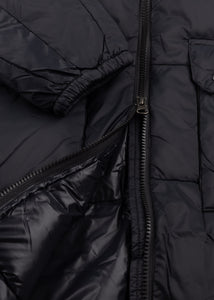 Quilted coat by Taion, stand-up collar with drawstring hood, two-way zip closure, long sleeves with elastic cuffs, flap pockets with snap fasteners , straight hem with drawstring, lined finish.
