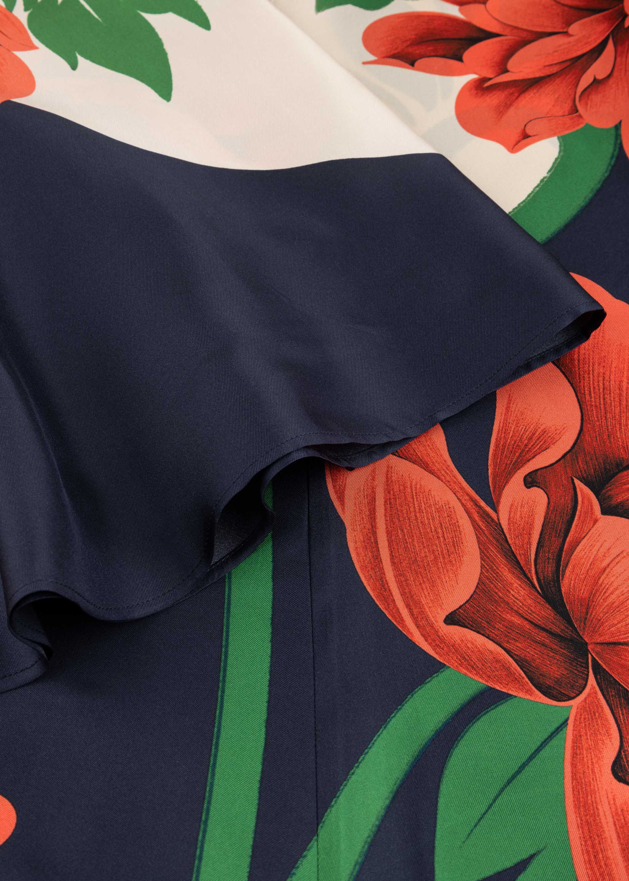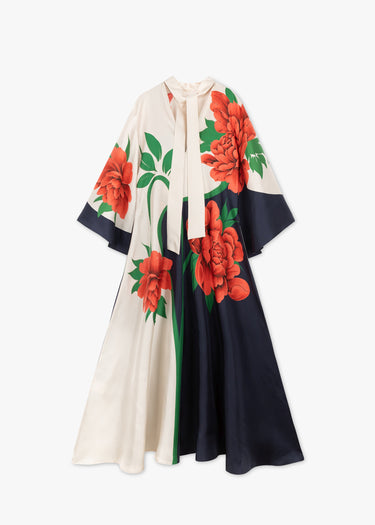 Flowing maxi dress 'Magnifico' by La Double J made of silk twill, stand-up collar with tie collar, shortened waterfall sleeves, side pockets, hand-placed peony print.