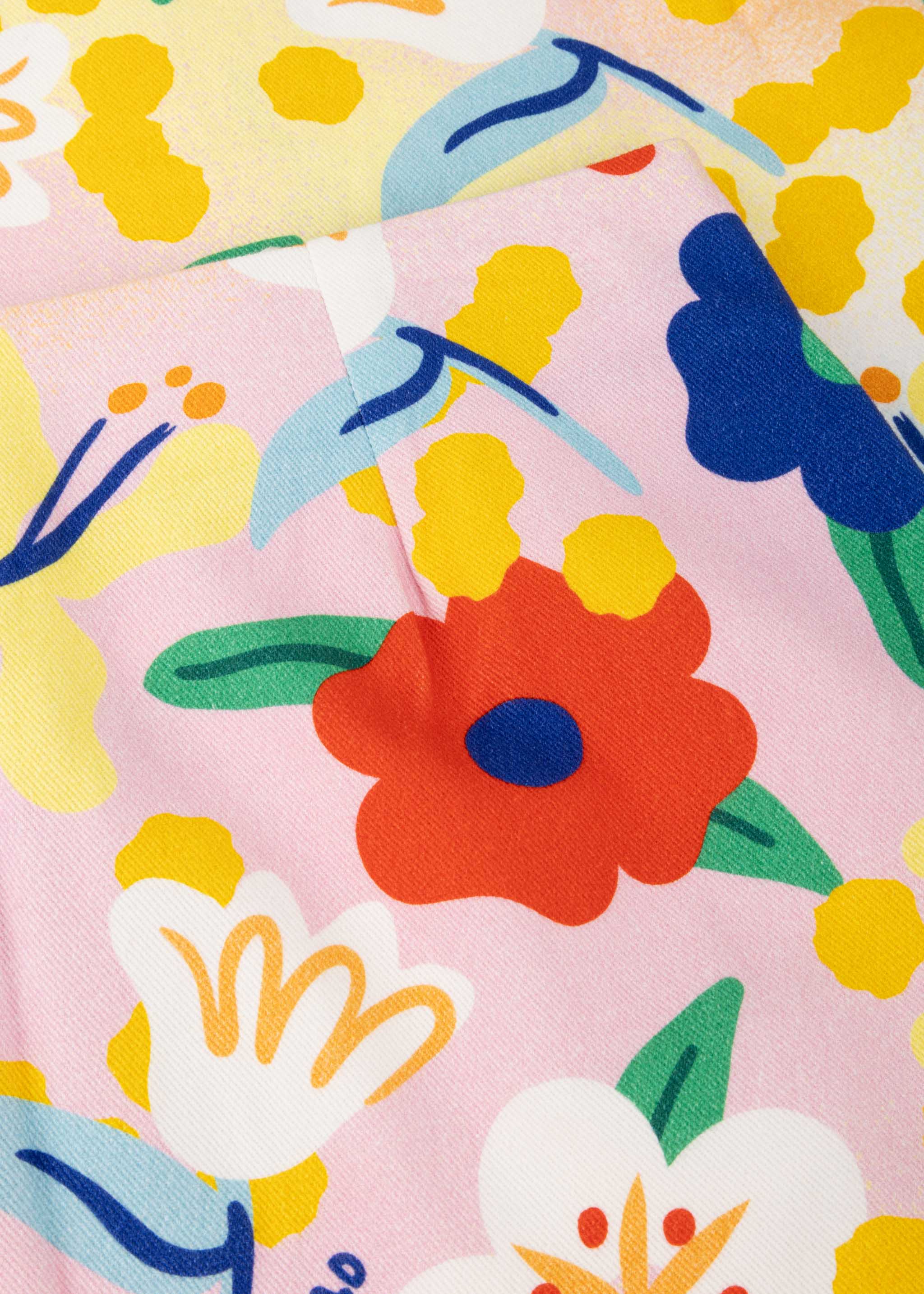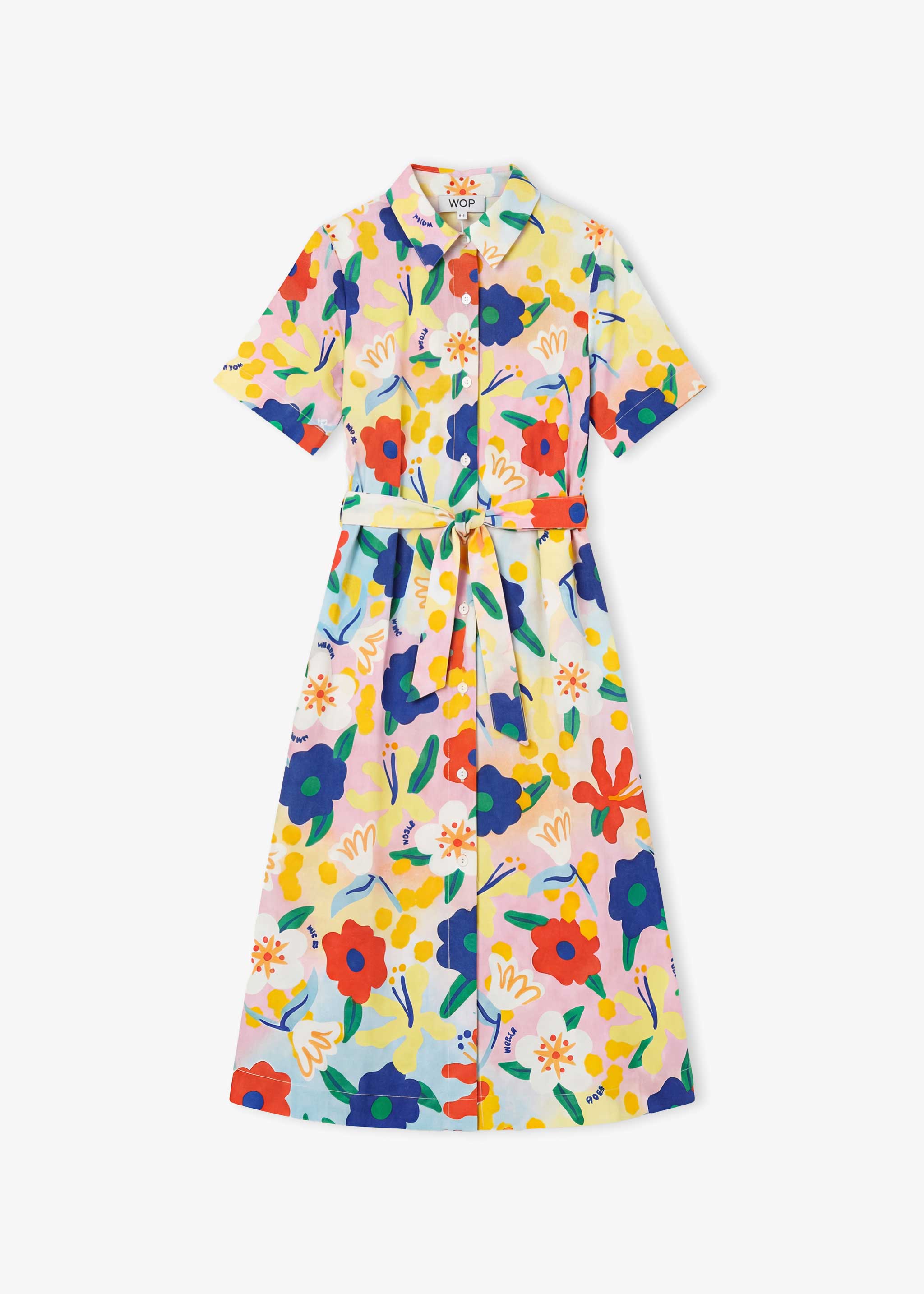 Long 'Flower Power' World of Pop dress in soft cotton, classic collar, fitted shoulders, short sleeves, full-length button placket, removable waist belt, straight hem, unlined.