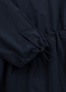 Voluminous maxi dress 'Carter' by YMC made of shimmering taffeta, round neck with button closure, long sleeves with drawstring, balloon-shaped skirt, side pockets, drawstring at the waist, knees and hem.