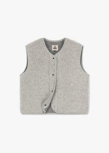 Short vest by Coldbreaker made of sheep's wool, round neck, snap button placket, straight hem.