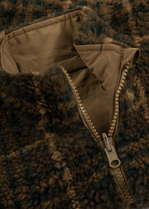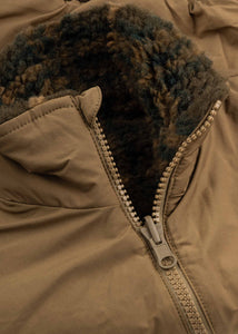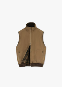 Filson reversible sleeveless vest with a stand-up collar, two-way zipper, side pockets with zippers, smooth inside, fleece-lined outside, and elastic ribbed hem.