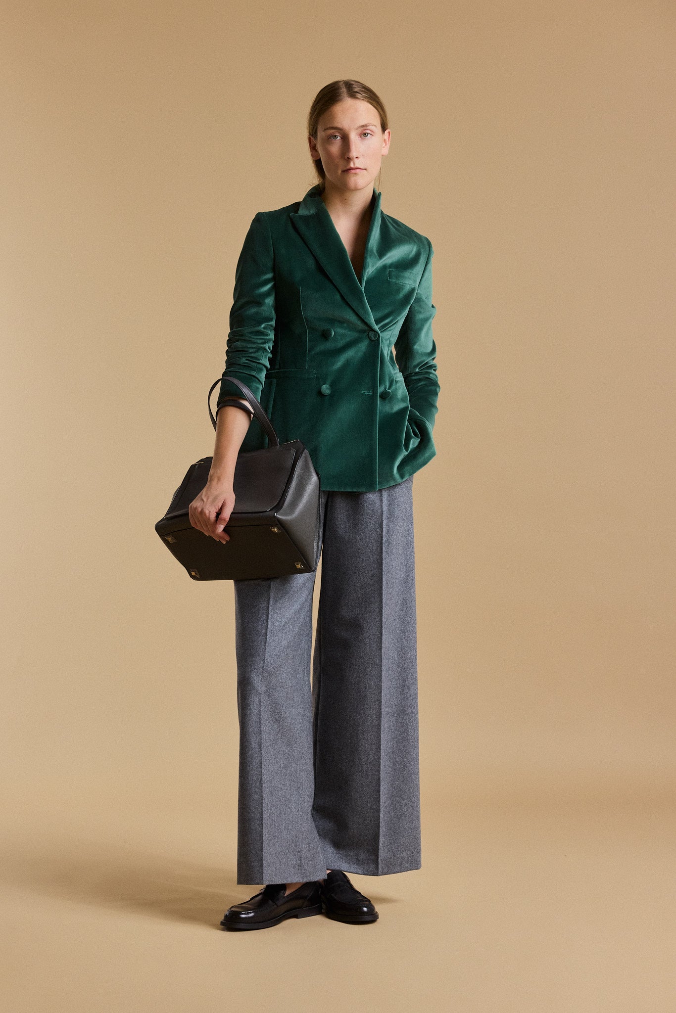 Double-breasted blazer 'Theda' by Carlo Piombo made of velvet, peak lapels, long sleeves with button cuffs, breast pocket, two piped pockets, back slit, partially lined, straight hem.