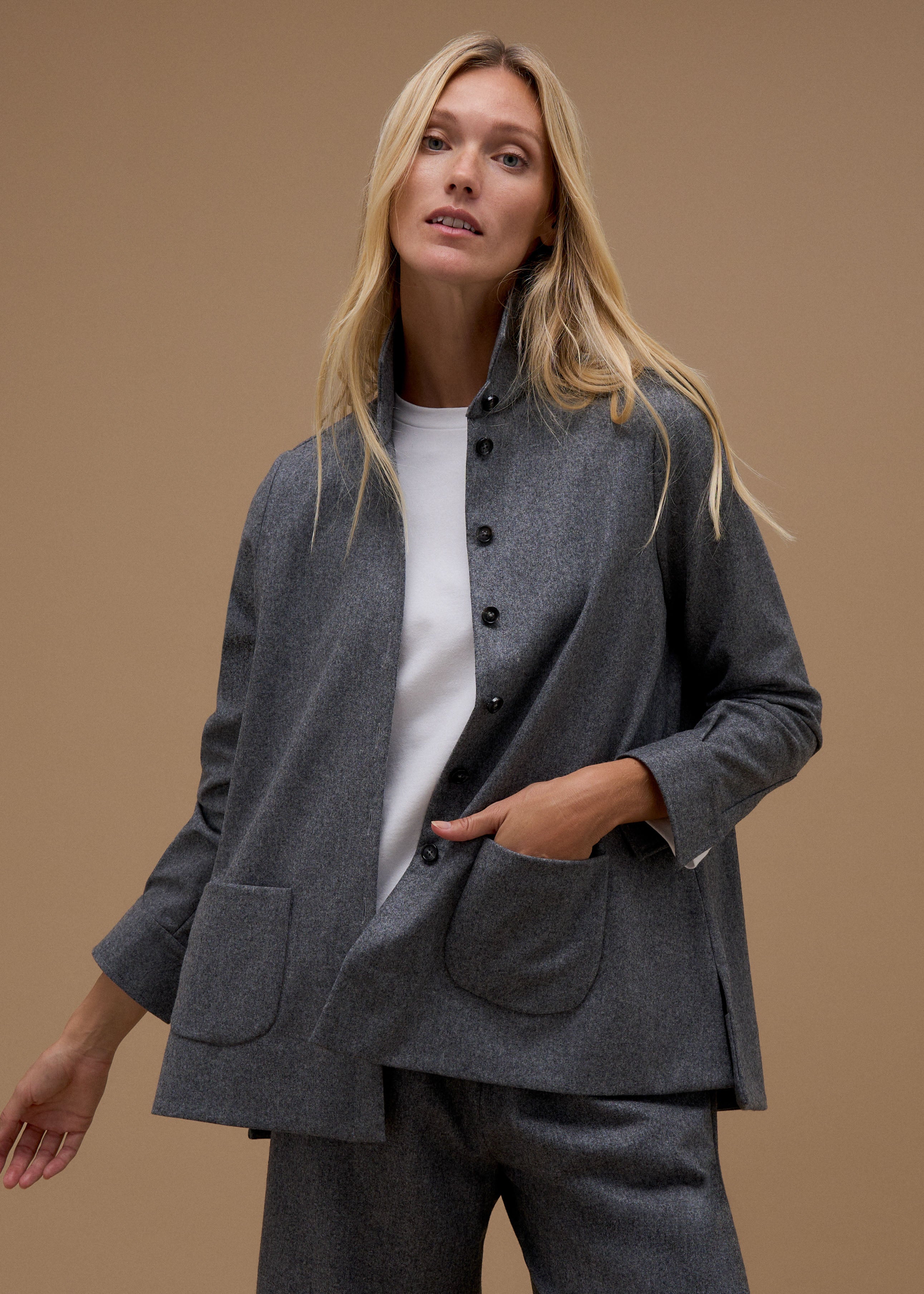 Jacket by PiaLea made of heavy loden, classic collar, dropped shoulders, long sleeves, back yoke with box pleat, full-length button placket, two patch pockets with flaps, straight hem, unlined.