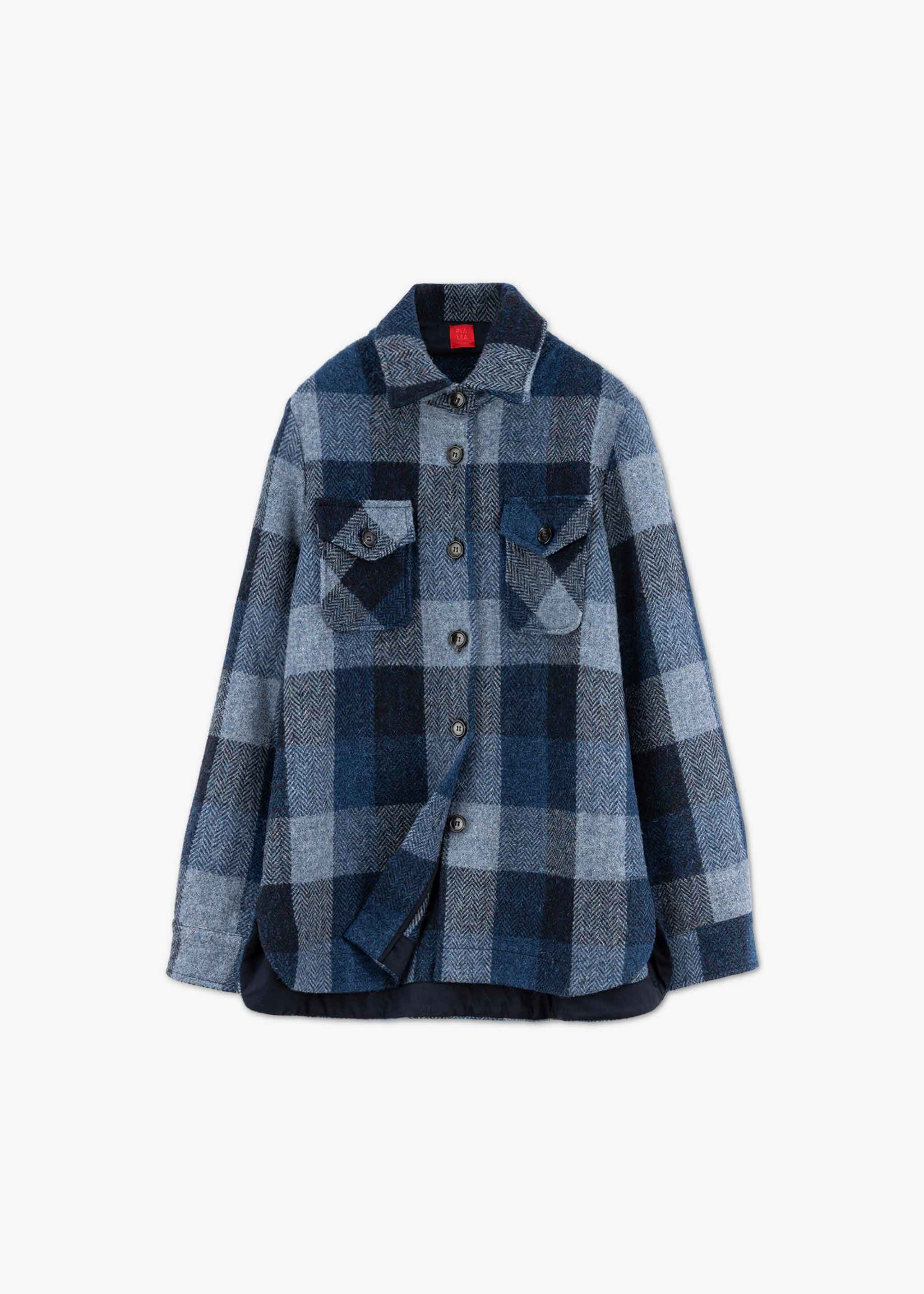 Structured jacket by Pialea made of heavy loden, classic collar, dropped shoulders, long sleeves, back yoke with box pleat, full-length button placket, two patch pockets with flaps, straight hem, unlined.