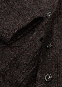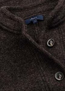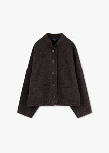 Loose-fitting 'Olympe' jacket by Soeur made of boiled virgin wool, featuring a round neck, dropped shoulders, wide sleeves, a button placket, piped pockets, a rounded hem at the front, and an unlined finish.