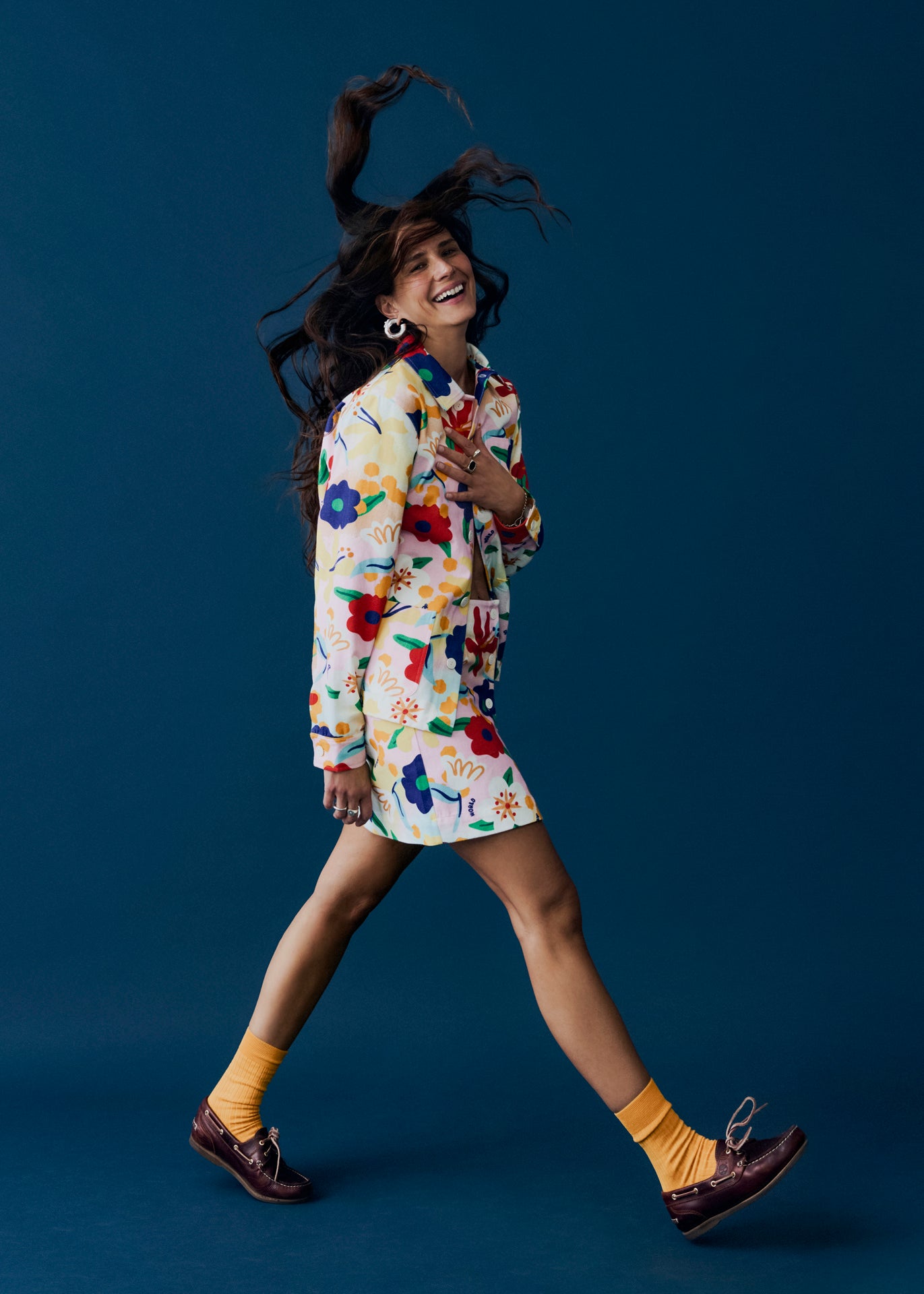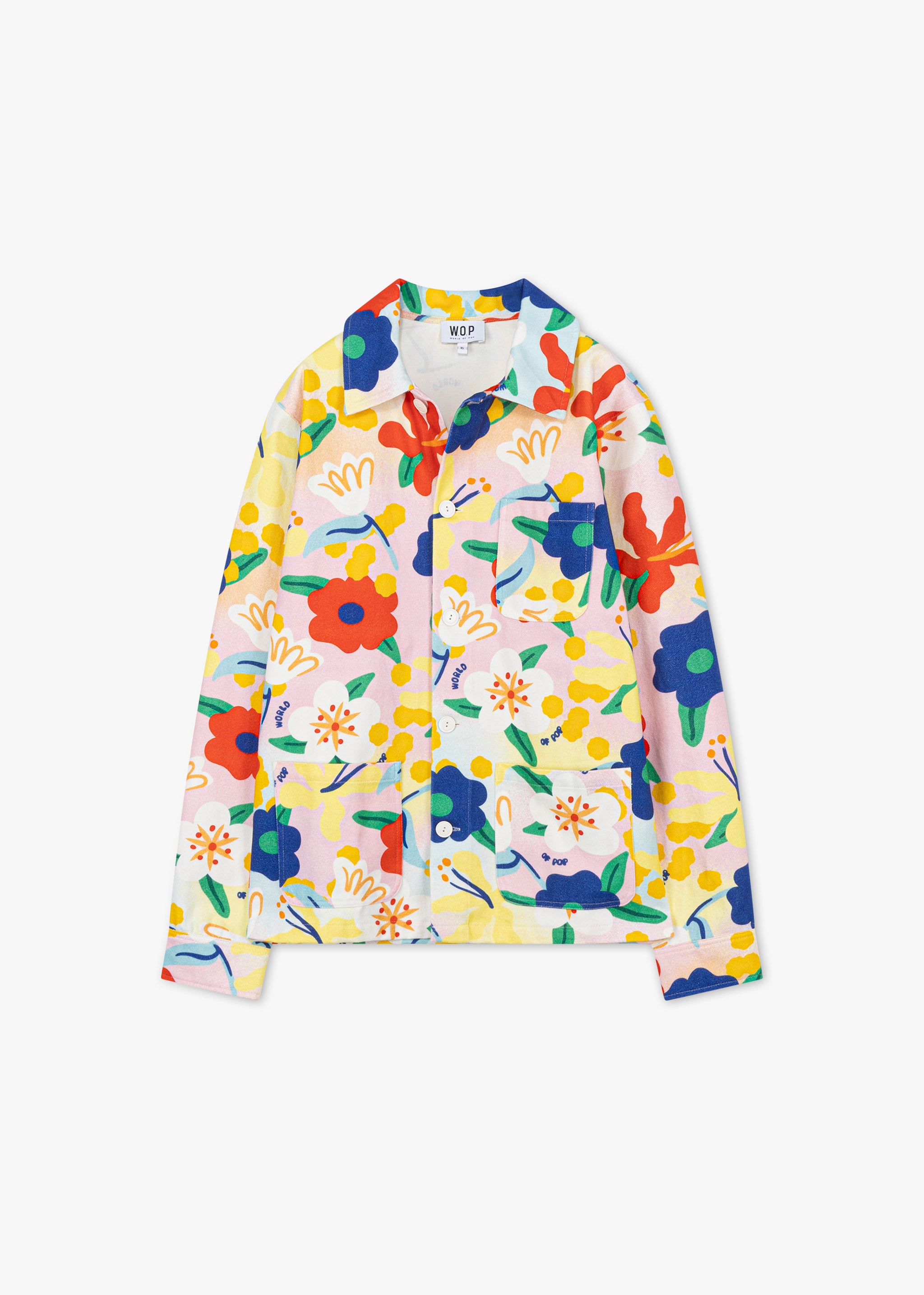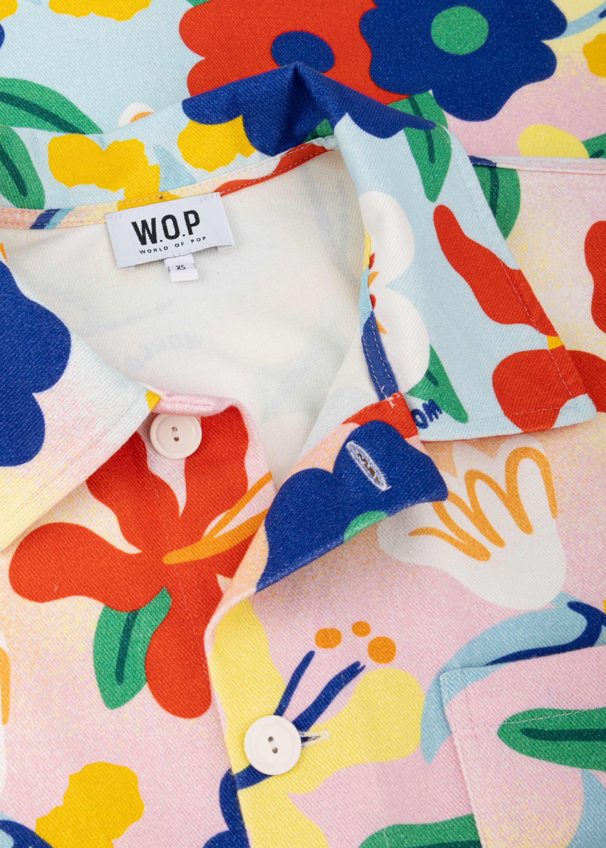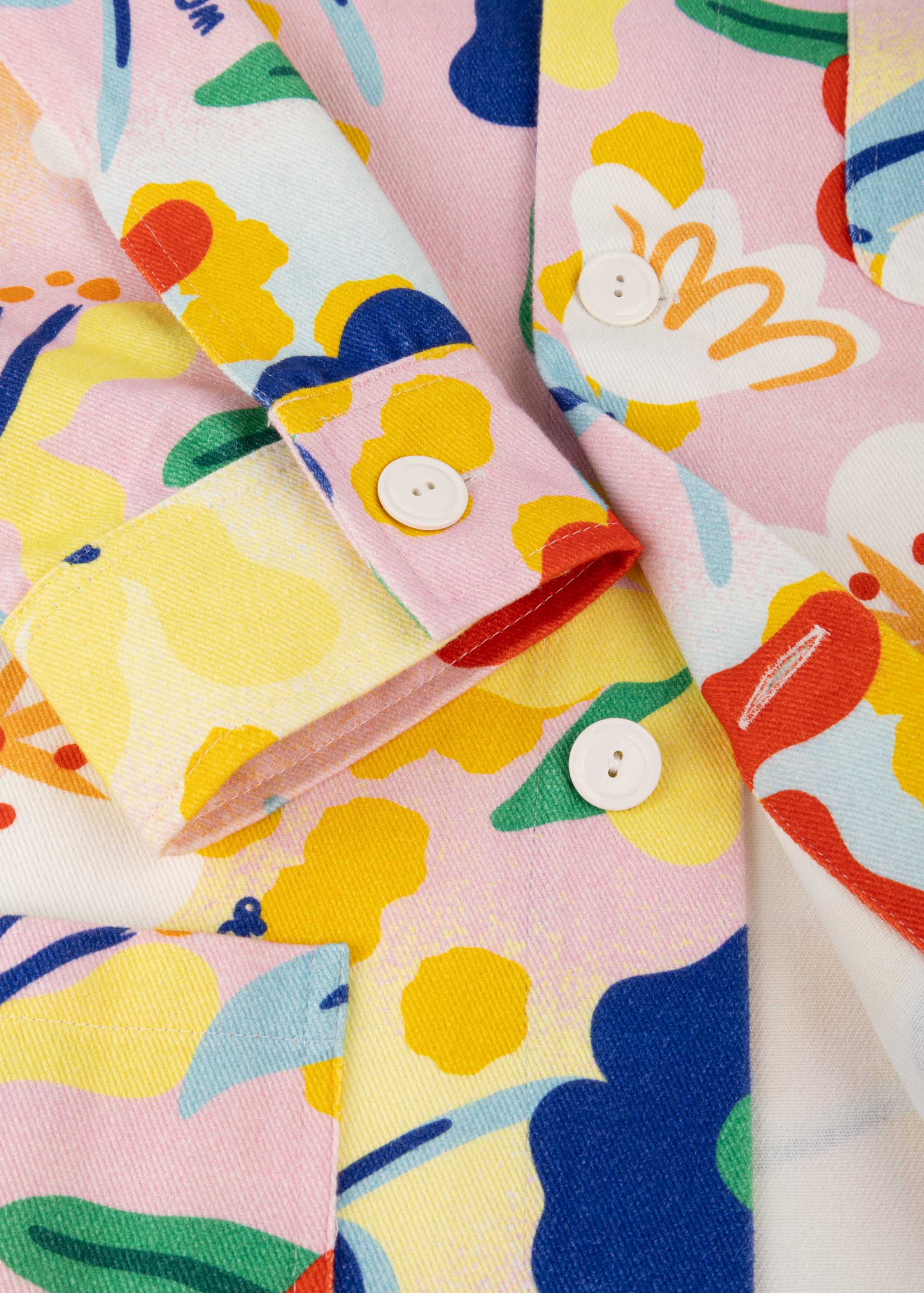 Jacket 'Flower Power' World of Pop made of soft cotton, classic collar, fitted shoulders, long sleeves with buttoned cuffs, button placket, three patch pockets, straight hem, unlined.