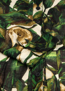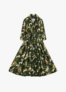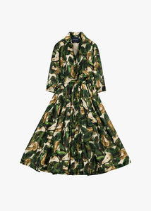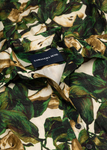 Patterned shirt dress by Samantha Sung, pointed collar, continuous button placket, laid folds, side pockets, shortened sleeves with one button each and an adjustable belt & extra tie ribbon.