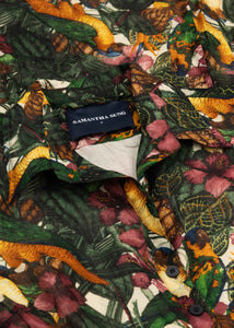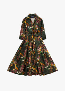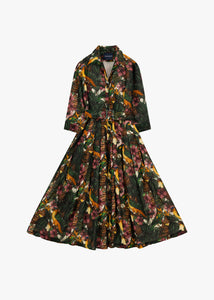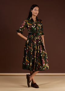 Patterned shirt dress by Samantha Sung, pointed collar, continuous button placket, laid folds, side pockets, shortened sleeves with one button each and an adjustable belt & extra tie ribbon.