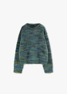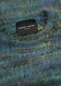 Short knitted sweater by Roberto Collina in a brushed merino-mohair blend, round neck, dropped shoulders, long sleeves, ribbed cuffs, and straight hem.
