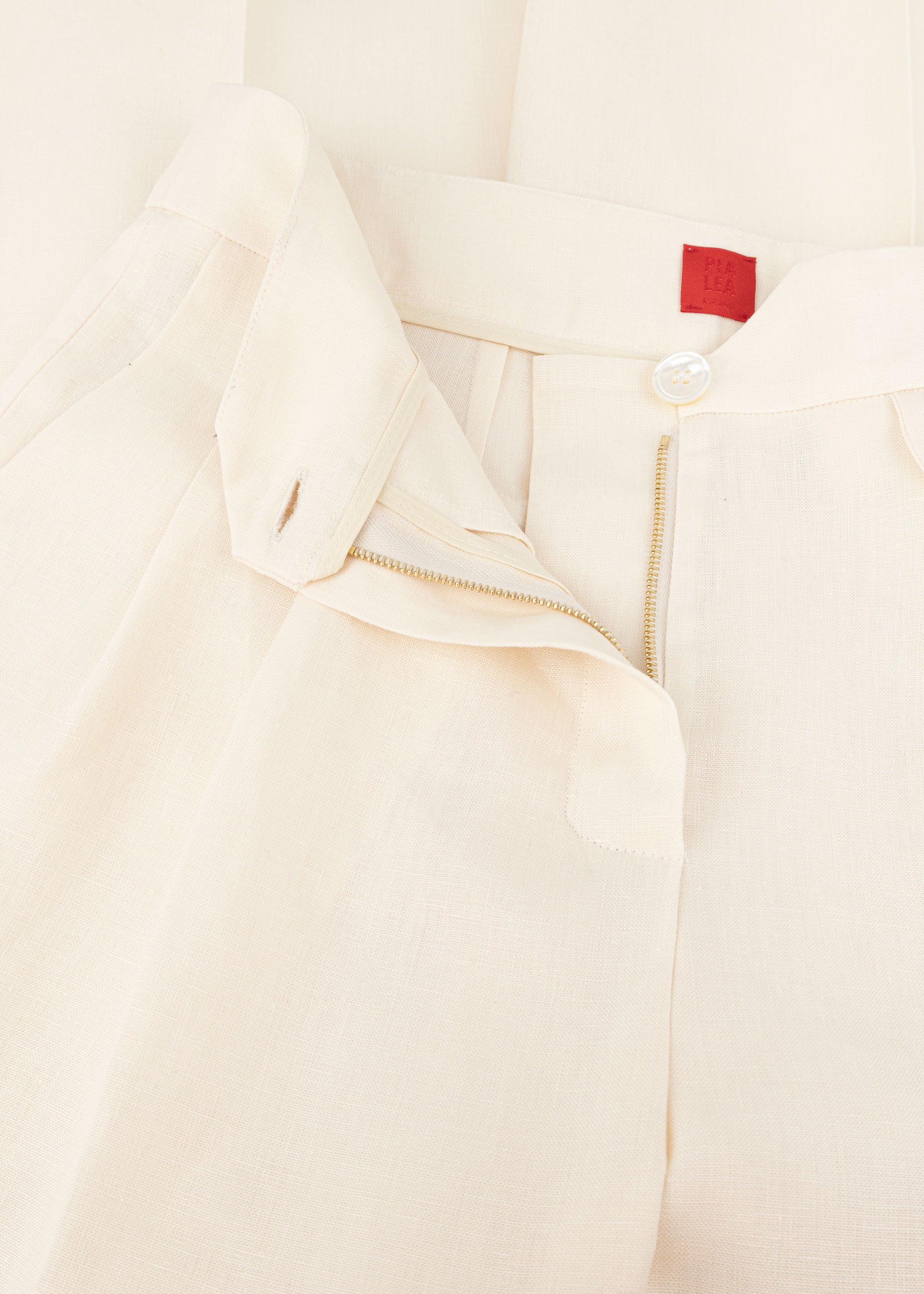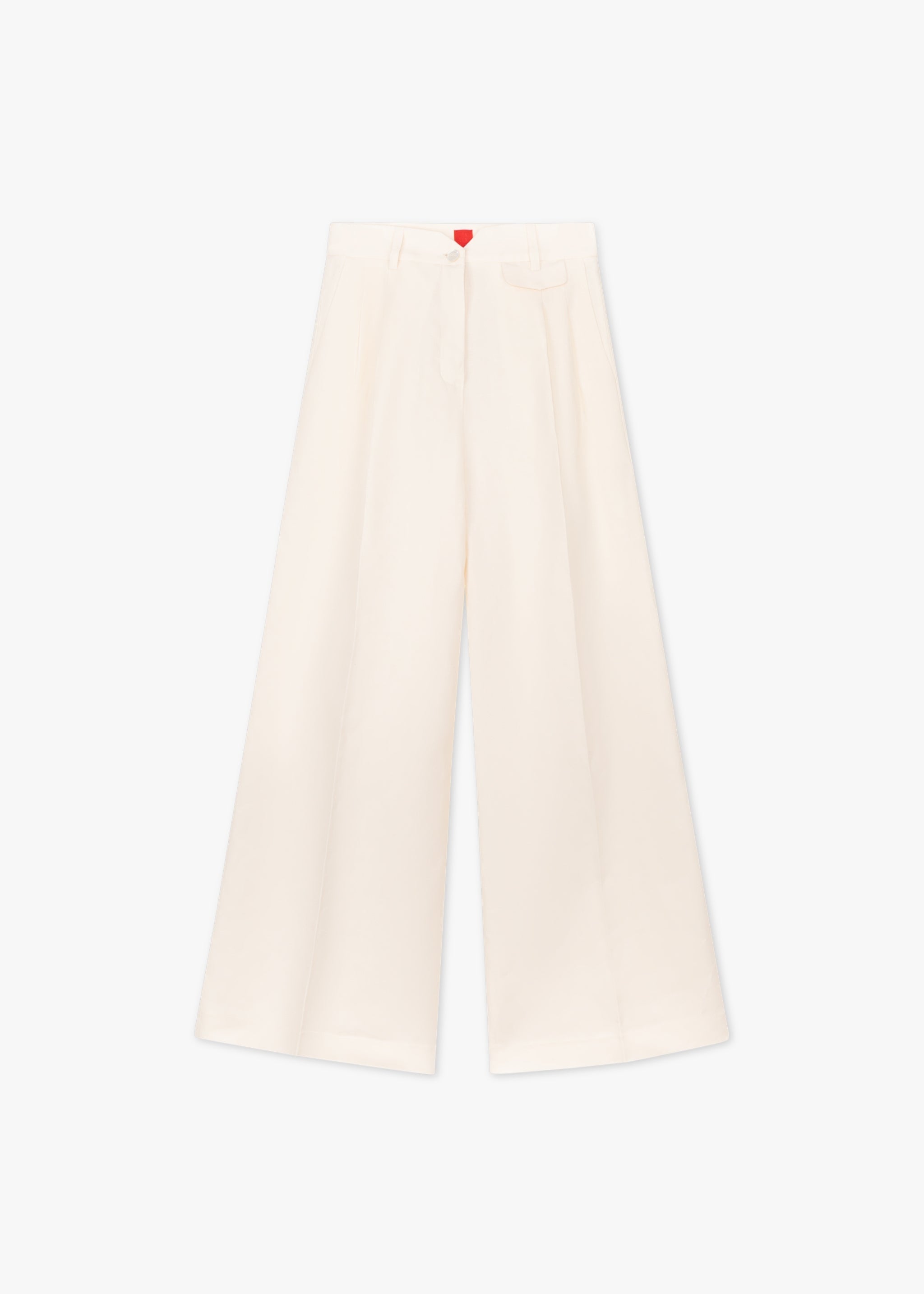 Long 'Carlotta Pants' by Pialea, pleated waistband, belt loops, button and zipper fastening, darts at the back waistband, creases, coin pocket, side pockets, one back pocket.