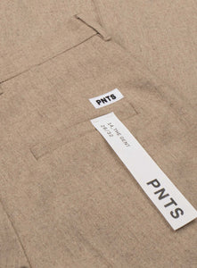 Wide-leg trousers 'The Gent' by PNTS made from a soft wool blend, featuring belt loops, snap fasteners and a zip fly, pleats, side pockets, and welt back pockets.