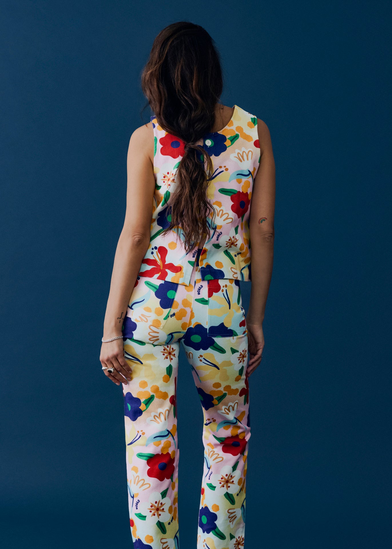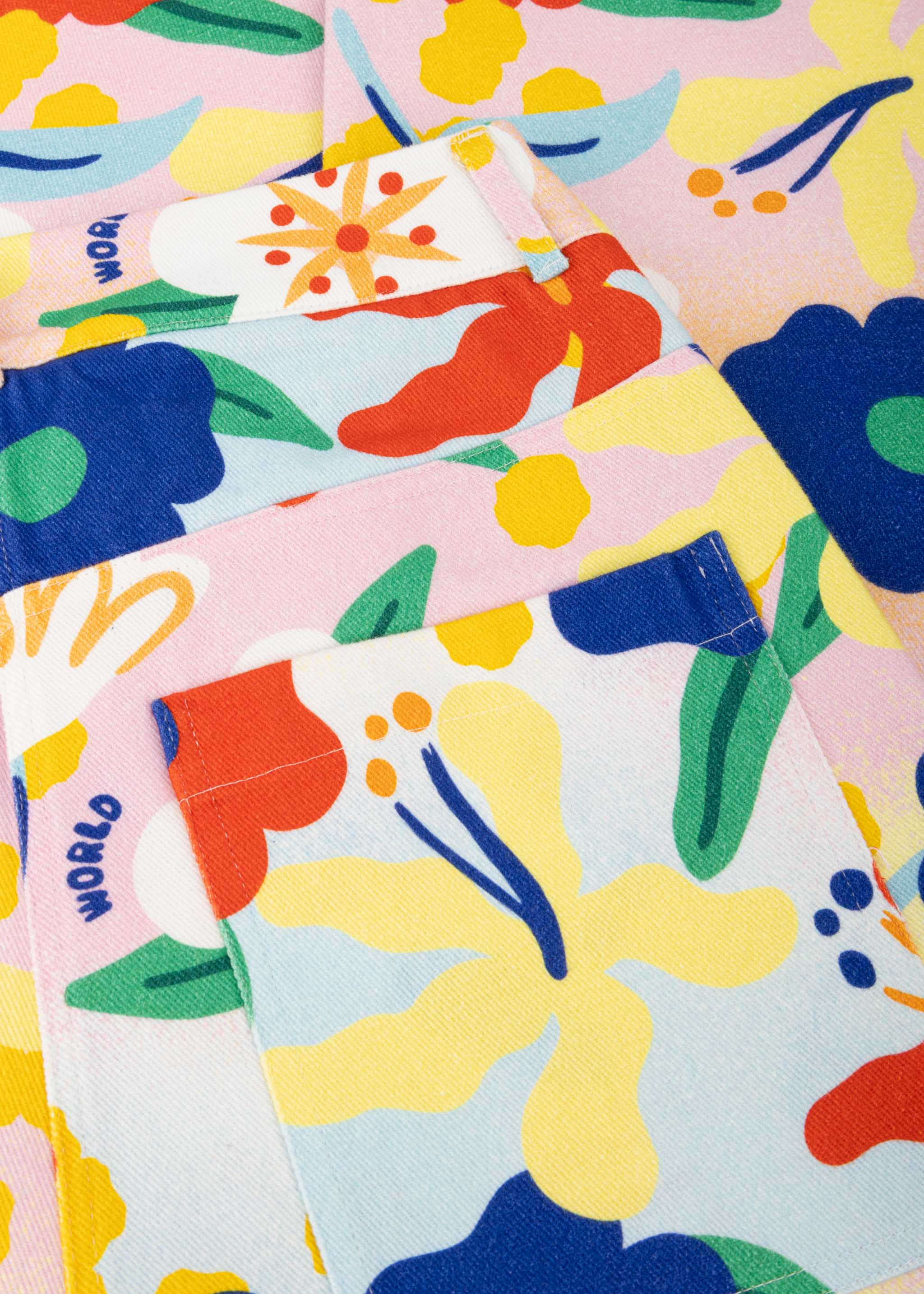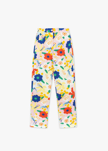 Trousers 'Flower Power' World of Pop made of soft cotton, high waist, belt loops, 5-pocket style, button and zip fastening, straight leg.